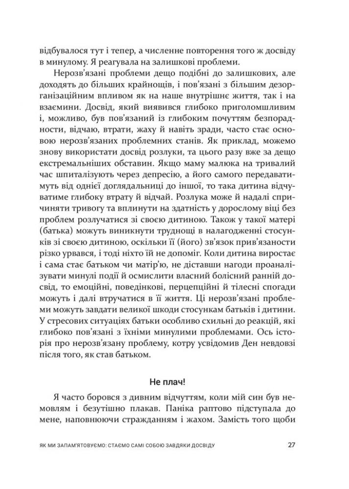 Батьківство – найважливіша робота у світі, і ця книжка робить її зрозумілішою та легшою. Вона дає нагоду поміркувати над тим, як виховували нас у дитинстві, залишити те, що діє, і знайти нові підходи до виховання власних дітей. Життєві ситуації, вправи для кращого розуміння себе, підсумки наукових досліджень допоможуть переосмислити свій колишній досвід, його вплив на те, ким ми стали сьогодні та як ми можемо впливати на розвиток наших дітей.У книжці вдало поєднано клінічний досвід відомого психіатра та глибоку мудрість дитячого педагога. Разом Д. Сіґел і М. Гарцел крок за кроком аналізують батьківство, щоби виявити справжню природу стосунків, яка є в їхній основі.Для усіх тих, хто хоче мати люблячі, довготривалі та змістовні стосунки зі своїми дітьми.