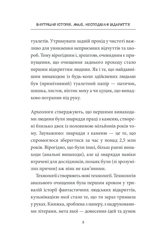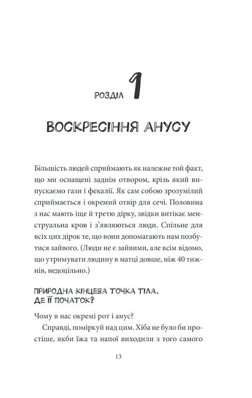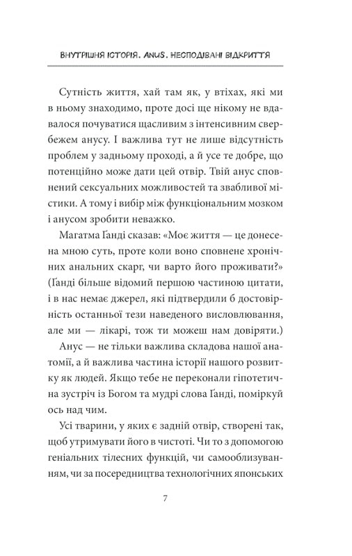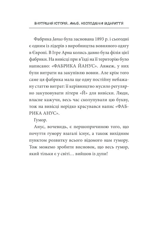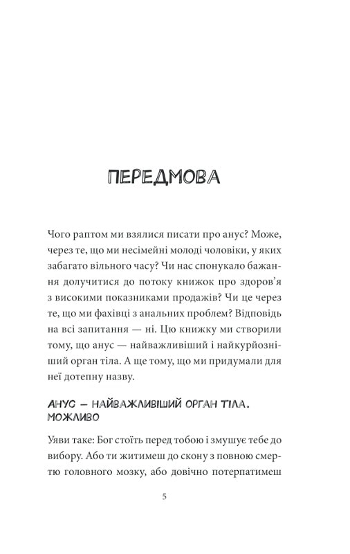 Декому здається, що анус не таїть в собі ніяких загадок. Але будь-який медик підтвердить, що це нісенітниця. Хтось скаже, що не існує серйозних анальних захворювань. І це твердження так самовпевнено, що навіть небезпечно. Інші вважають, що анус має елементарну анатомічну будову. Однак це не так.Двоє норвезьких лікарів без сорому розкажуть про найважливіше у самому смішному отворі людського тіла і дадуть відповідь на всі питання, які ви боялися поставити (якщо вони взагалі з’являлися у вашому мозку).Книга для всіх шанувальників медицини і чорного гумору!П’ять причин купити:• Це насправді не жарт — на кожній сторінці важливі медичні факти, які допоможуть зберегти здоров’я.• Жарти, якщо говорити чесно, теж будуть.• Розмова на сором’язливу тему, після якої ви приймете всі особливості свого тіла без винятків.• Дивні, але забавні ілюстрації до серйозних розділів книги.• Єдина в світі книга, яка розповість про роботу «того самого місця» у всіх аспектах людського життя