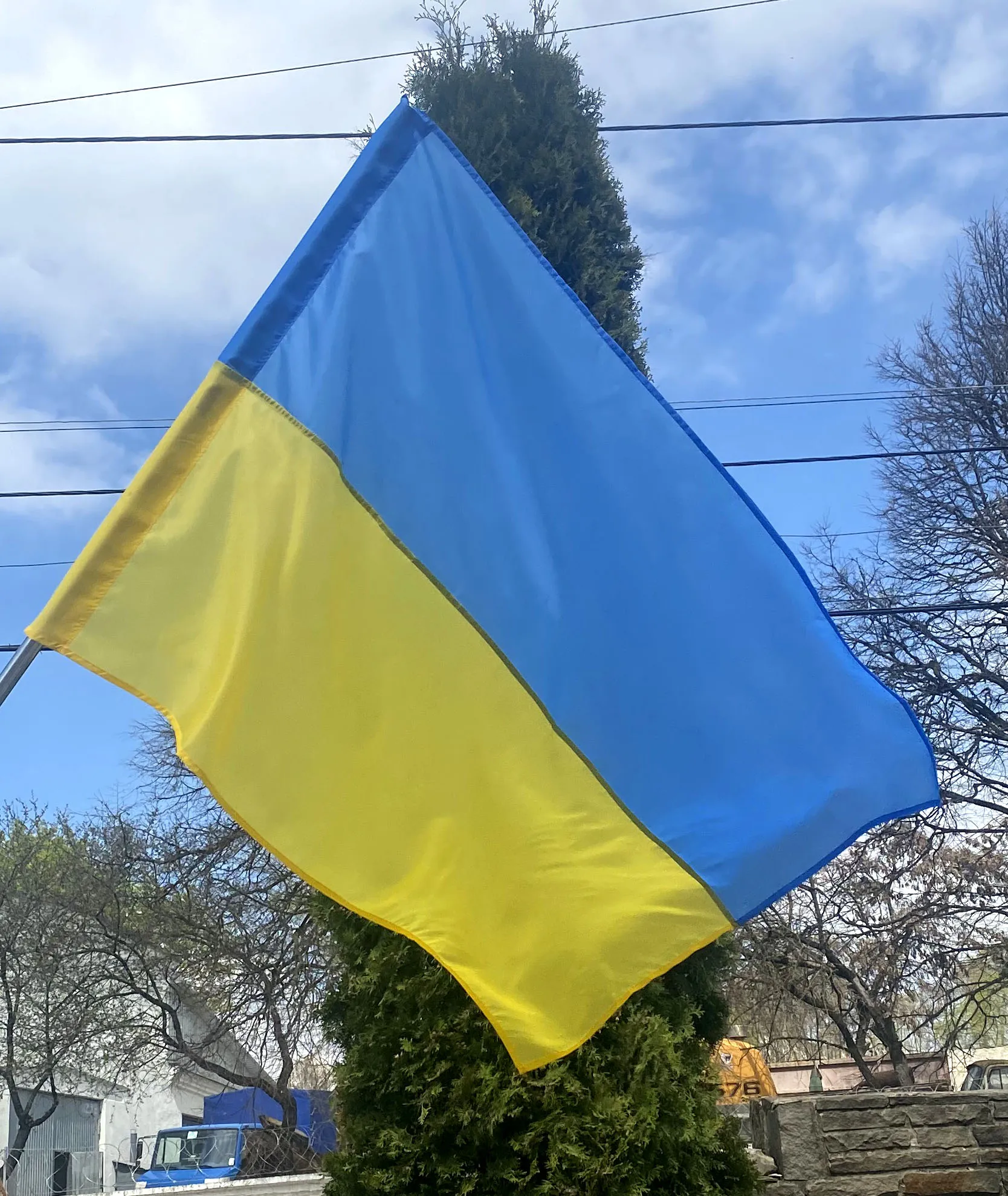 Прапор виготовлено з двох смуг однакового розміру з синтетичного атласу жовтого та блакитного кольорів. Тканина з відблиском має святковий вигляд. Загальний розмір 90 х 135 см. Цупка тканини та надійні шви забезпечують строк експлуатації від 1 року і більше. В бічній частині є спеціальний манжет (ширина 7,5 см) для древка прапора.