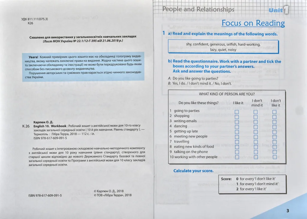 Робочий зошит до підручника «Англійська мова (10-й рік навчання). Рівень стандарту» для 10 класу закладів загальної середньої освіти автора О. Карпюк відповідає оновленій програмі з іноземних мов з 1 вересня 2018 року.