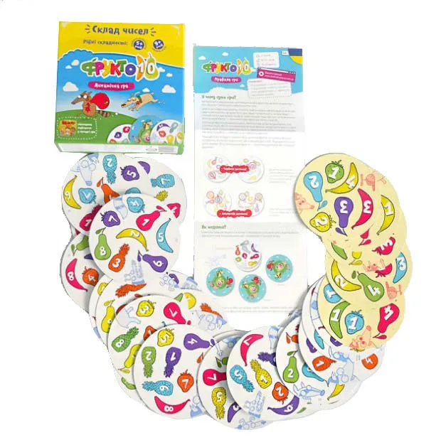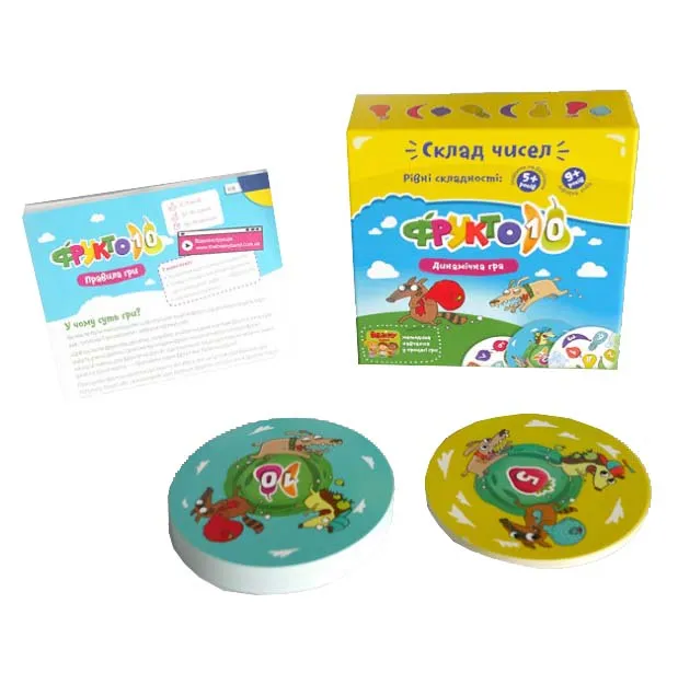 "Фрукто-10" чудовий спосіб тренувати навички швидкого рахунку, адже тут доведеться наввипередки шукати відповідні фрукти з числами! Ця гра чудово тренує уважність і вміння концентруватися. Щоб виграти, потрібно набрати якомога більше карт за гру. Для цього потрібно швидше інших знаходити на двох картах (своєї і в центральній стопці) фрукти, які в сумі дадуть 10. Весь інтерес в тому, що ці фрукти повинні бути або одного кольору, або одного виду! У грі швидко запам'ятовується склад чисел, розвивається вміння миттєво рахувати. Також гра чудово розвиває навик концентрації уваги і безпомилковість. У грі передбачені варіанти спрощення та ускладнення правил: з молодшими дітьми в неї можна грати, виключивши швидкісний компонент, а з дітьми старшого віку можна шукати не тільки десятки, а й інші числа, і використовувати не тільки складання, а й віднімання.