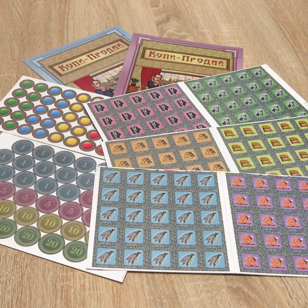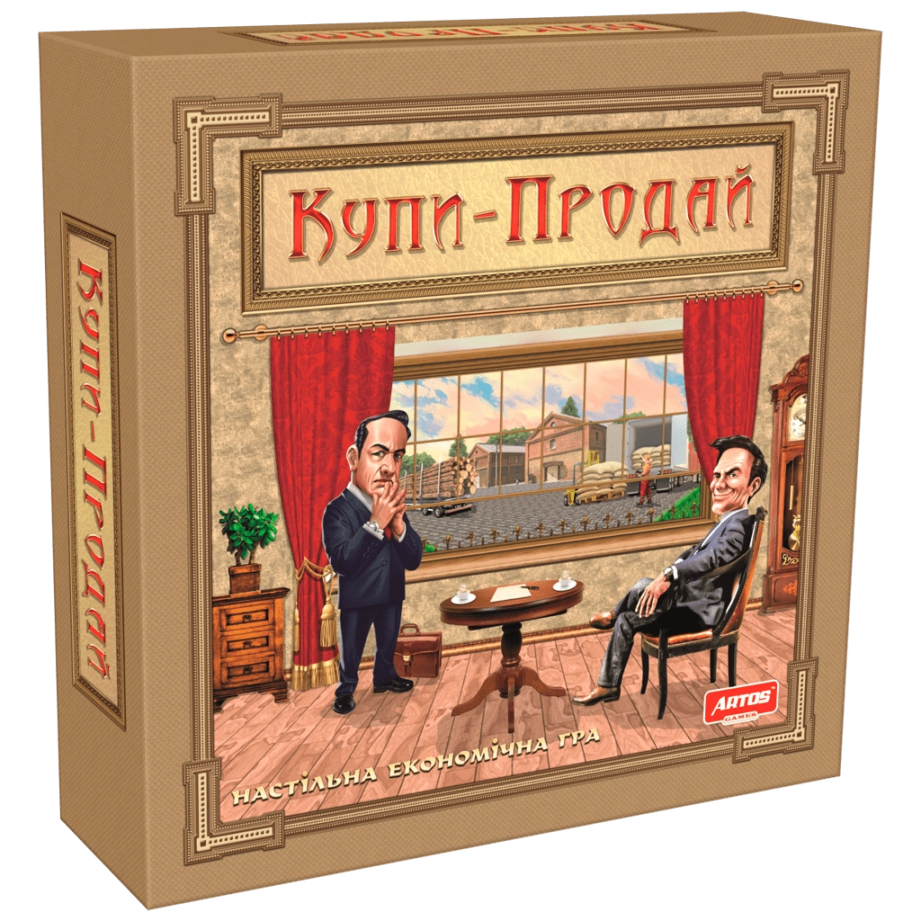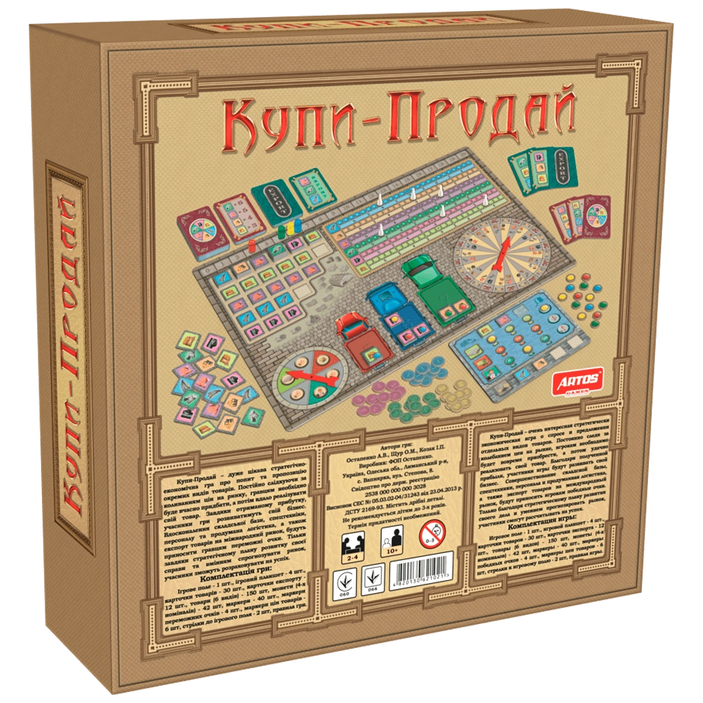 «Купи-продай» – дуже цікава стратегічна економічна гра про попит та пропозицію окремих видів товарів. Постійно слідкуючи за коливанням цін на ринку, гравцям необхідно буде вчасно придбати, а потім вдало реалізувати свій товар. Завдяки отриманому прибутку учасники гри розвиватимуть свій бізнес. Вдосконалення складської бази, спецтехніки, персоналу та продумана логістика, а також експорт товарів на міжнародний ринок будуть приносити гравцям переможні очки. Тільки завдяки стратегічному плану розвитку своєї справи та вмінням спрогнозувати ринок учасники зможуть розраховувати на успіх. Комплектація гри: - Ігрове поле – 1 шт. - Ігровий планшет – 4 шт. - Карточки товарів – 30 шт. - Карточки експорту – 12 шт. - Товари (6 видів) – 150 шт. - Монети (4-х номіналів) – 42 шт. - Маркери – 40 шт. - Маркери переможних очок – 4 шт. - Маркери цін товарів – 6 шт. - Стрілки до ігрового поля – 2 шт. - Правила гри.