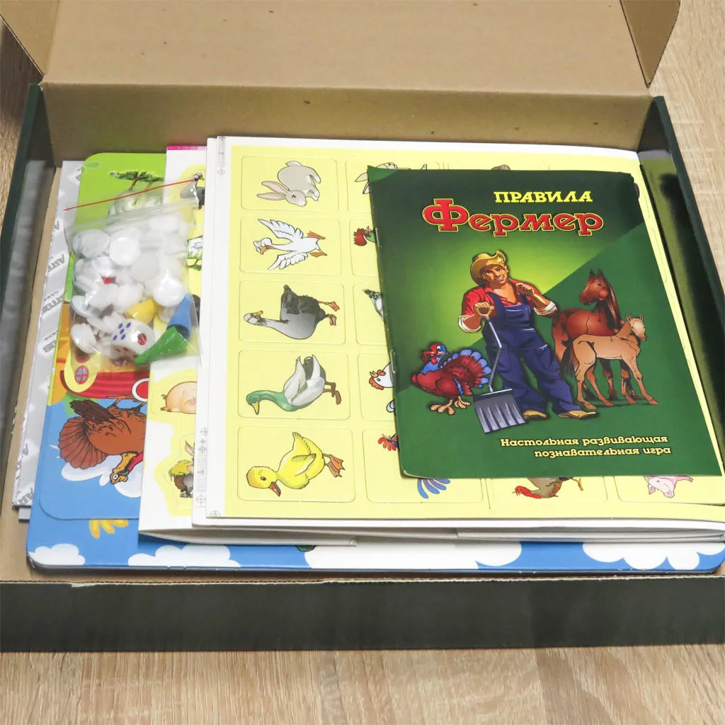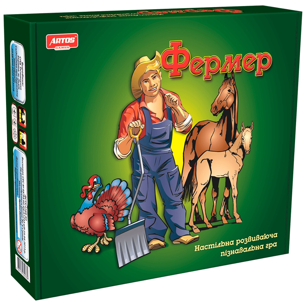 «Фермер» – настільна розвиваюча пізнавальна гра для дітей від 6 років. Пропонована Вашій увазі гра познайомить дитину зі світом домашніх тварин, навчить розрізняти їх по видах, а також відрізняти свійських тварин від диких. Гра сприяє розвитку уваги, логічного мислення, математичних здібностей.