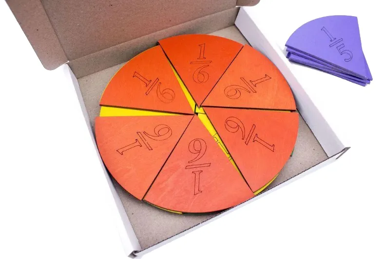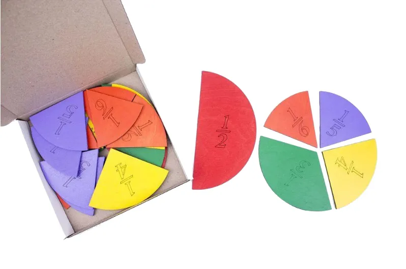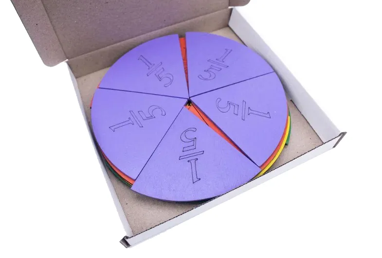 Набір виготовлений з деревини, має яскраве забарвлення. На зворотній стороні прикріплені магніти для демонстрації на магнітній дошці. Набір призначений для вивчення поняття «дроби». Складається з наборів кіл, що марковані по долях. Комплектація: 1/2 – 2 шт. 1/3 – 3 шт. 1/4 – 4 шт. 1/5 – 5 шт. 1/6 – 6 шт. Рекомендований для шкільного використання. Пофарбований в яскраві кольори фарбами на водній основі. Відповідає вимогам концепції Нової української школи.