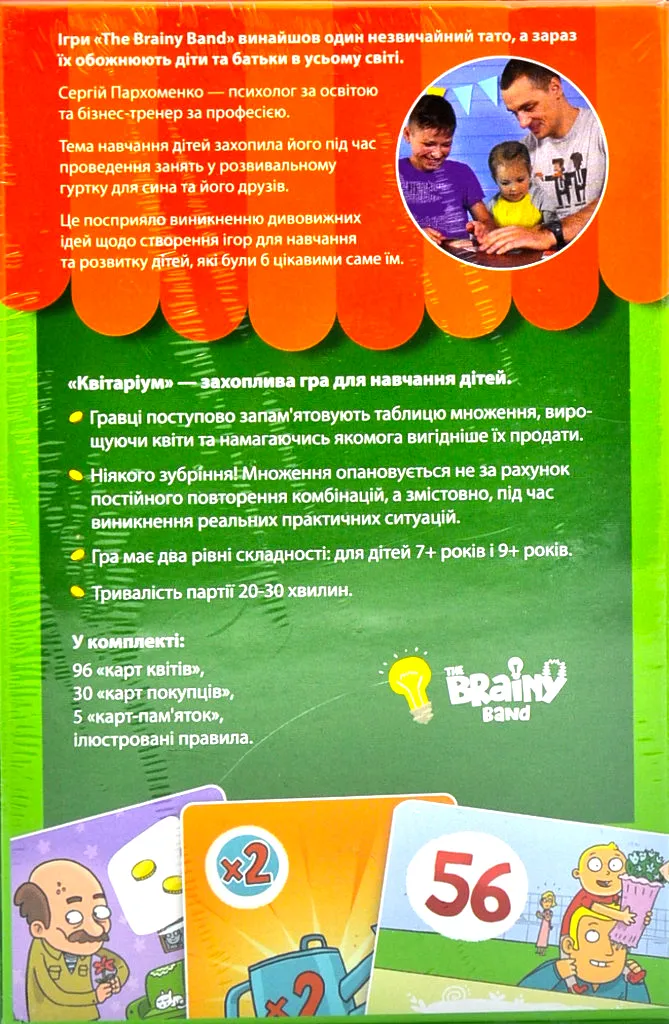 Настільна гра «Квітаріум» – чудовий спосіб швидко запам'ятати таблицю множення, а головне – в ігровій формі! Принцип гри простий – складати однакові числа, що призведе до розуміня суті множення. Для цього діти будуть виконувати замовлення по вирощуванню на клумбах квітів, причому саме таку кількість, скільки побажає покупець. І якщо надійшло замовлення на 18 квітів, то знадобиться 3 клумби з 6-ма квітами на кожній. Наглядно та просто! Комплектація: - прямокутні карти з квітами – 96 шт; - квадратні карти з покупцями – 30 шт; - карти-пам'ятки – 5 шт; - правила з ілюстраціями. Гра рекомендована для дітей від 7-ми років. У грі можуть брати участь від 2-х до 5-ти осіб.