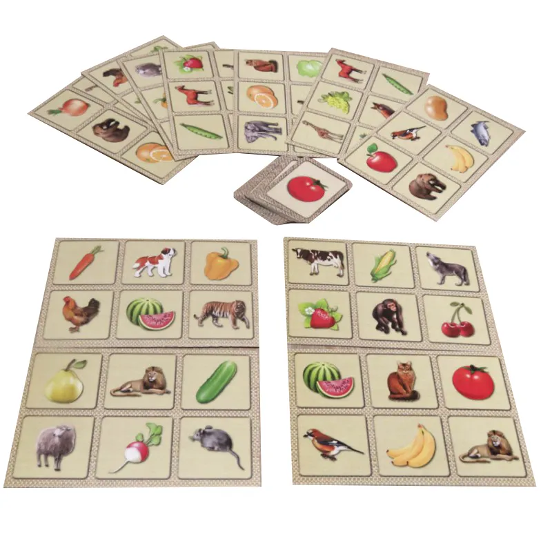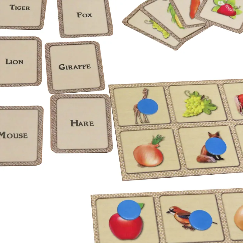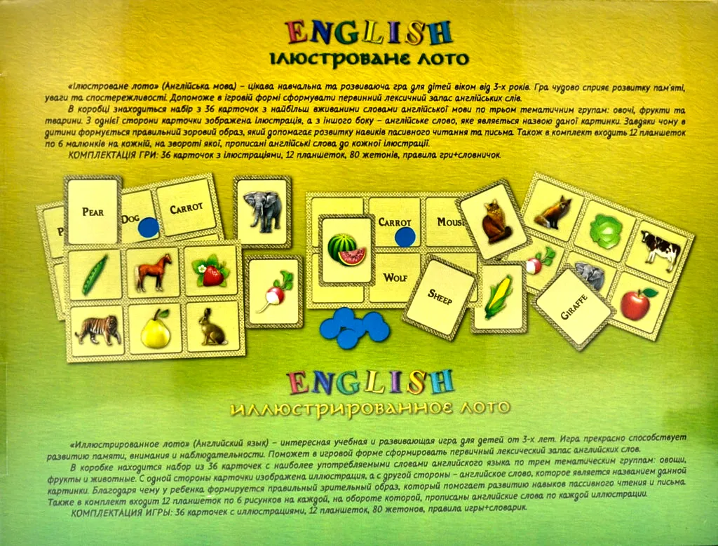 «Ілюстроване лото» – цікава навчальна та розвиваюча гра для дітей віком від 3-х років. Гра чудово сприяє розвитку пам’яті, уваги та спостережливості. Допоможе в ігровій формі сформувати первинний лексичний запас англійських слів. В коробці знаходиться набір з 36 карточок з найбільш вживаними словами англійської мови по трьом тематичним групам: овочі, фрукти та тварини. З однієї сторони карточки зображена ілюстрація, а з іншого боку – англійське слово, яке являється назвою даної картинки. Завдяки чому в дитини формується правильний зоровий образ, який допомагає розвитку навиків пасивного читання та письма. Також в комплект входить 12 планшеток (по 6 малюнків на кожній), на звороті яких – англійські слова, відповідні ілюстраціям.