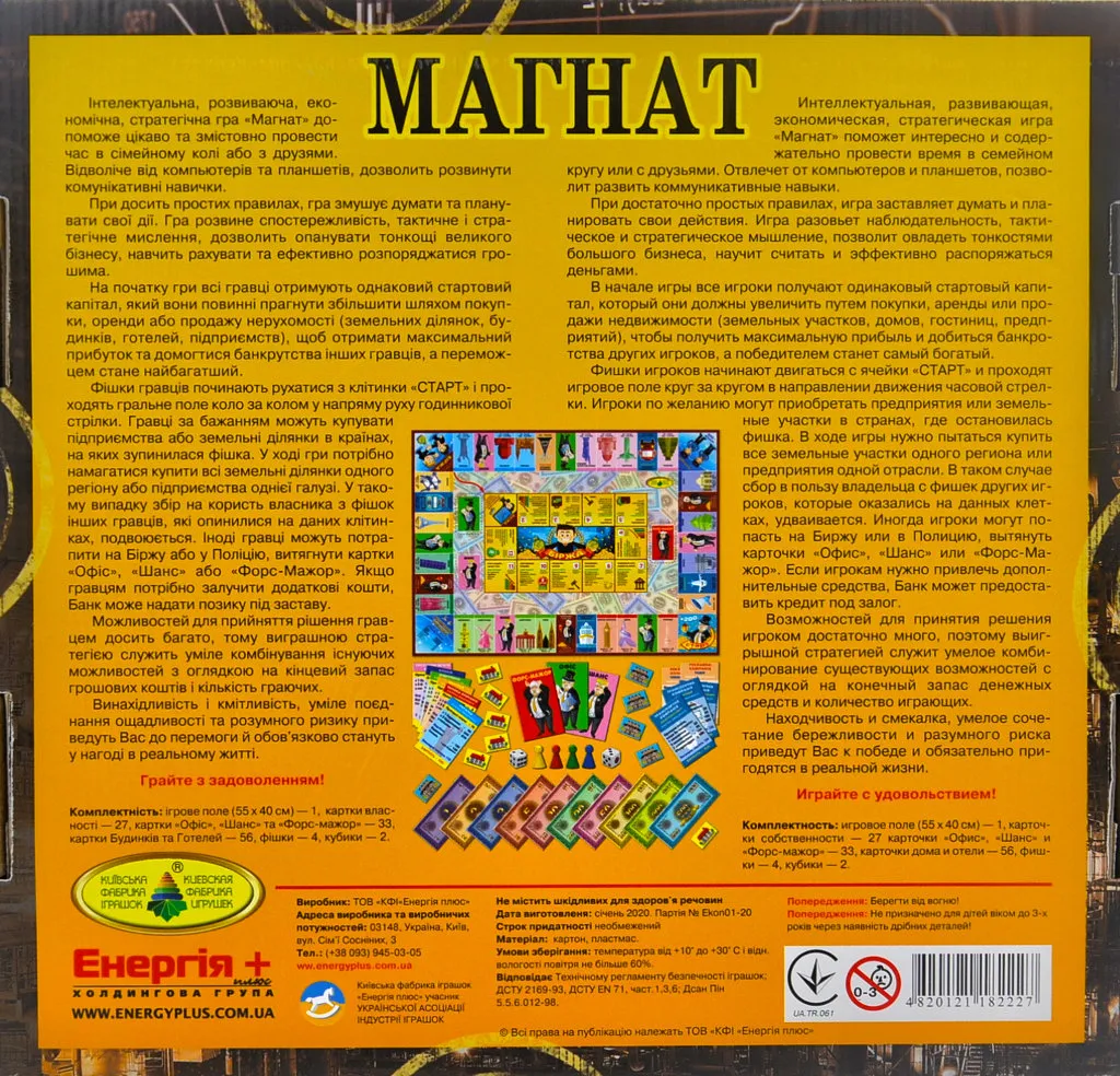 Інтелектуальна розвиваюча економіко-стратегічна гра «Магнат» допоможе цікаво та змістовно провести час у сімейному колі або з друзями, дозволить розвинути комунікативні навички. Гра спонукає думати і планувати свої дії, розвиває спостережливість, тактичне і стратегічне мислення, дозволить опанувати тонкощі великого бізнесу, навчить рахувати і ефективно розпоряджатися грошима. На початку гри всі гравці отримують однаковий стартовий капітал, який вони повинні збільшити шляхом покупки, оренди або продажу нерухомості (земельних ділянок, будинків, готелів, підприємств), щоб отримати максимальний прибуток та добитися банкрутства інших гравців, а переможцем стане найзаможніший. Винахідливість і кмітливість, вміле поєднання ощадливості і розумного ризику приведуть Вас до перемоги і обов'язково стануть у нагоді в реальному житті. Комплектація: ігрове поле (40 х 55 см) – 1, картки власності – 27, картки «Офіс», «Шанс» і «Форс-мажор» – 33, картки будинків і готелів – 56, фішки – 4, кубики – 2.