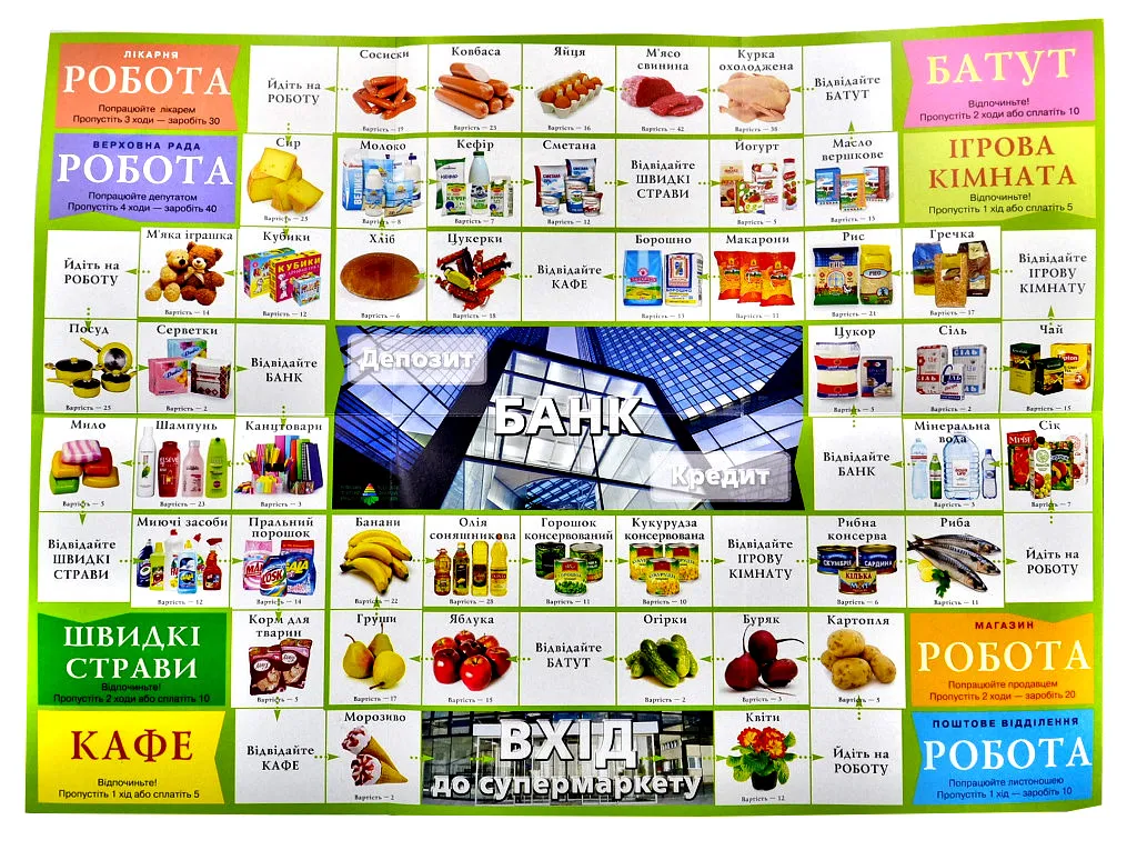 Комплектація: ігрове поле - 1, карти-завдання - 8, картки-товари - 48, картки-гроші - 63, картки "Депозит", "Кредит" - 16, фішки - 3, кубик - 1.