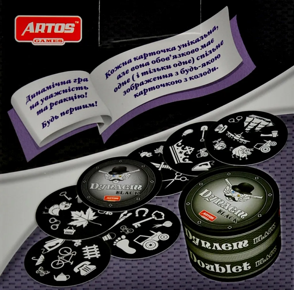 «Дуплет Black» – весела динамічна гра, що розвиває зорове сприйняття, увагу та концентрацію. Ця гра чудово підійде як діткам, так і дорослим. Для гри використовується колода з 57 круглих карточок з безліччю зображень. Кожна карточка унікальна. На ній розміщені 8 картинок, але тільки одна з них співпадає з зображенням на будь-якій іншій карточці з колоди. Ігровий процес побудований на пошуку збігів. Гравець повинен першим знайти зображення, котре збігається на обох карточках. Далі йому необхідно озвучити дане зображення, а потім взяти або скинути відповідну картку (в залежності від варіанту гри).