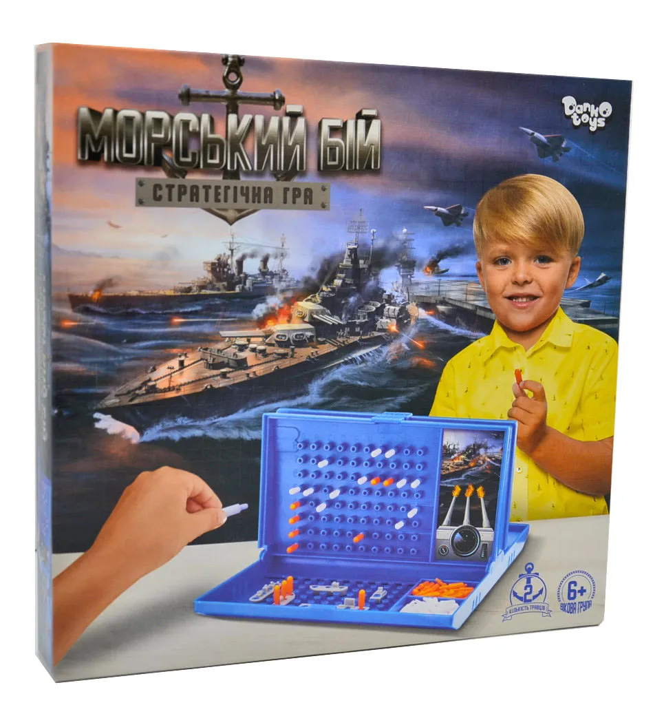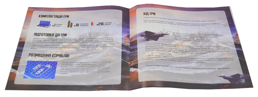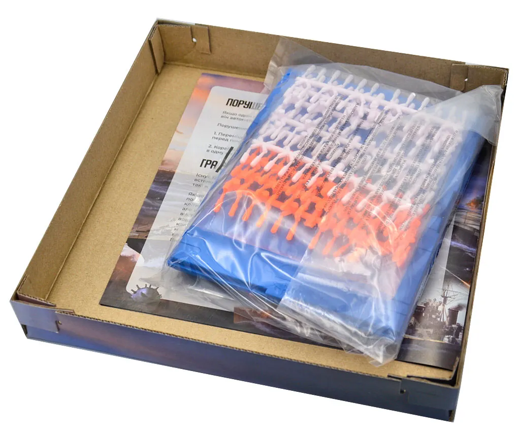 Комплектація:- ігрове поле - 1 шт.,- бойові кораблі - 10 шт.,- ігрові фішки - 216 шт.,- інструкція - 1 шт.
