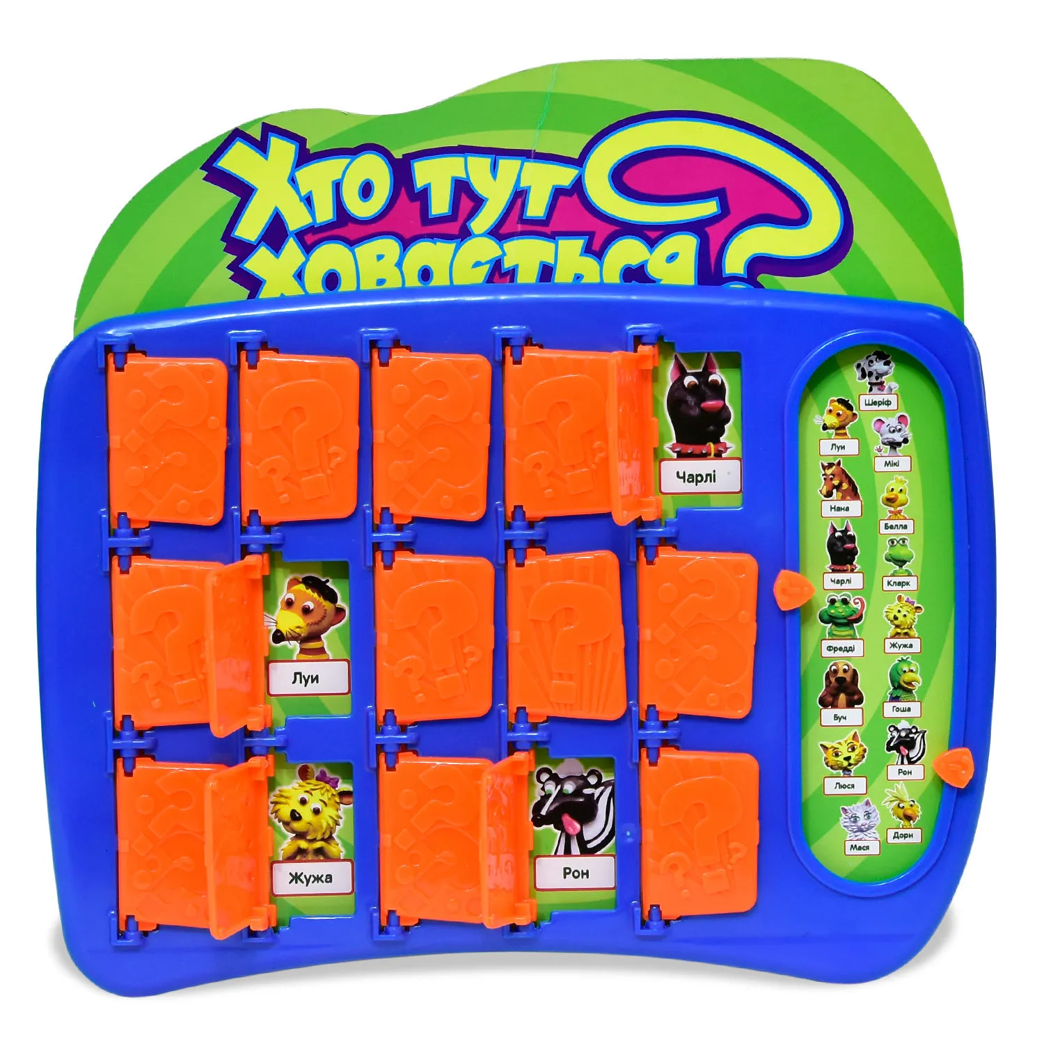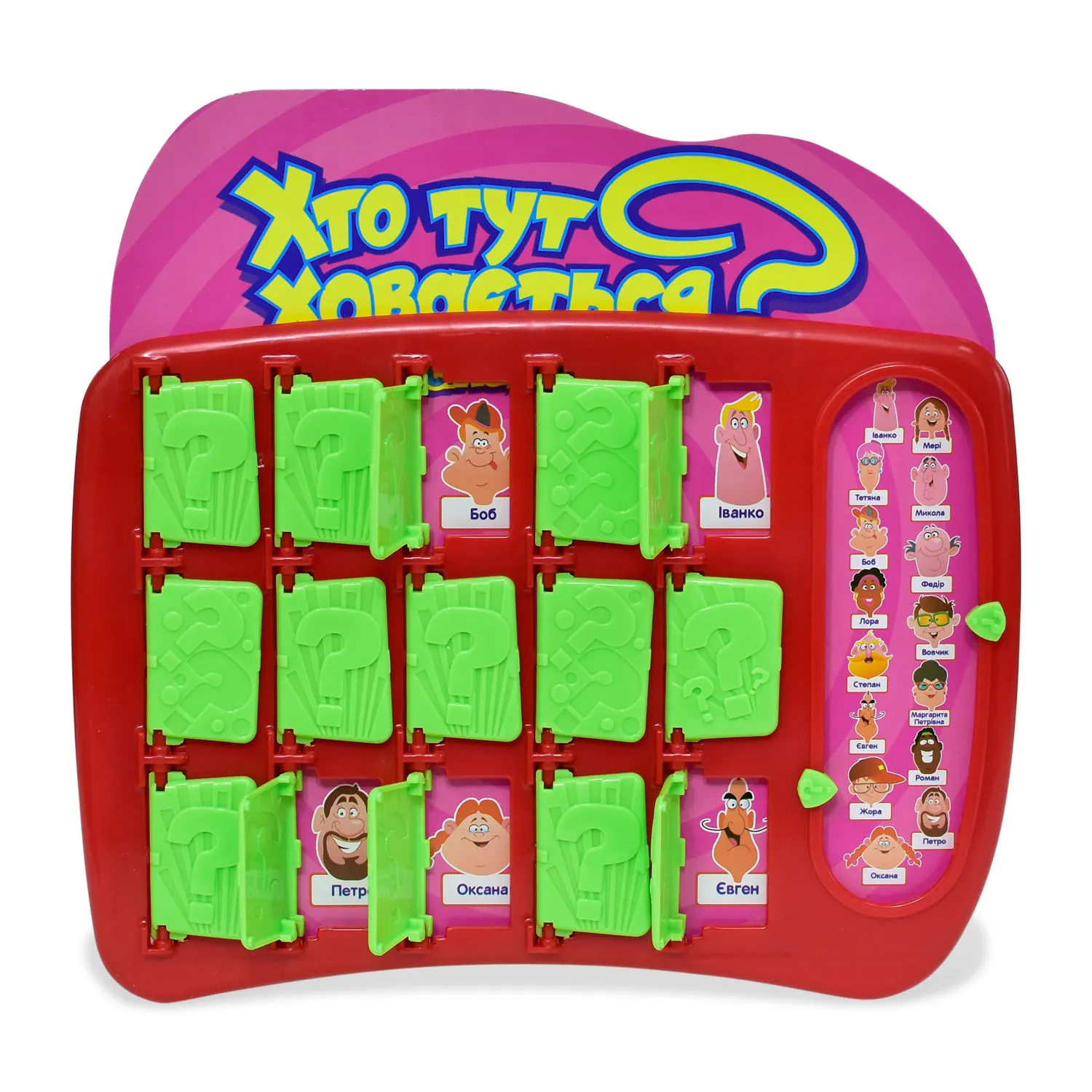 Настільна гра «Хто тут ховається?» - розважальна логічна гра для дітей і їх батьків!Суперника потрібно знати в обличчя! Але пам'ятай, це не єдине, що може допомогти тобі здобути перемогу! Мета гри «Хто тут ховається?» - вгадати персонажа на мапі суперника і стати переможцем через п'ять вгадувань.Кожному гравцеві дається по одній платформі і одному набору героїв. Після вибору таємних персонажів, гра починається!Проявляйте кмітливість і задавайте питання один одному на які є тільки дві можливих відповіді: «Так» або «Ні». Тренуйте своє логічне мислення і шляхом виключення вгадуйте таємного персонажа свого супротивника, який ховається за дверима.Будьте пильні і не дай супернику підглянути твій вибір! Стати переможцем просто - необхідно розсекречувати персонажів супротивника протягом п'яти раундів! Комплектація:• дві ігрових платформи,• два листа з зображеннями персонажів,• два маркера.Кількість гравців: 2