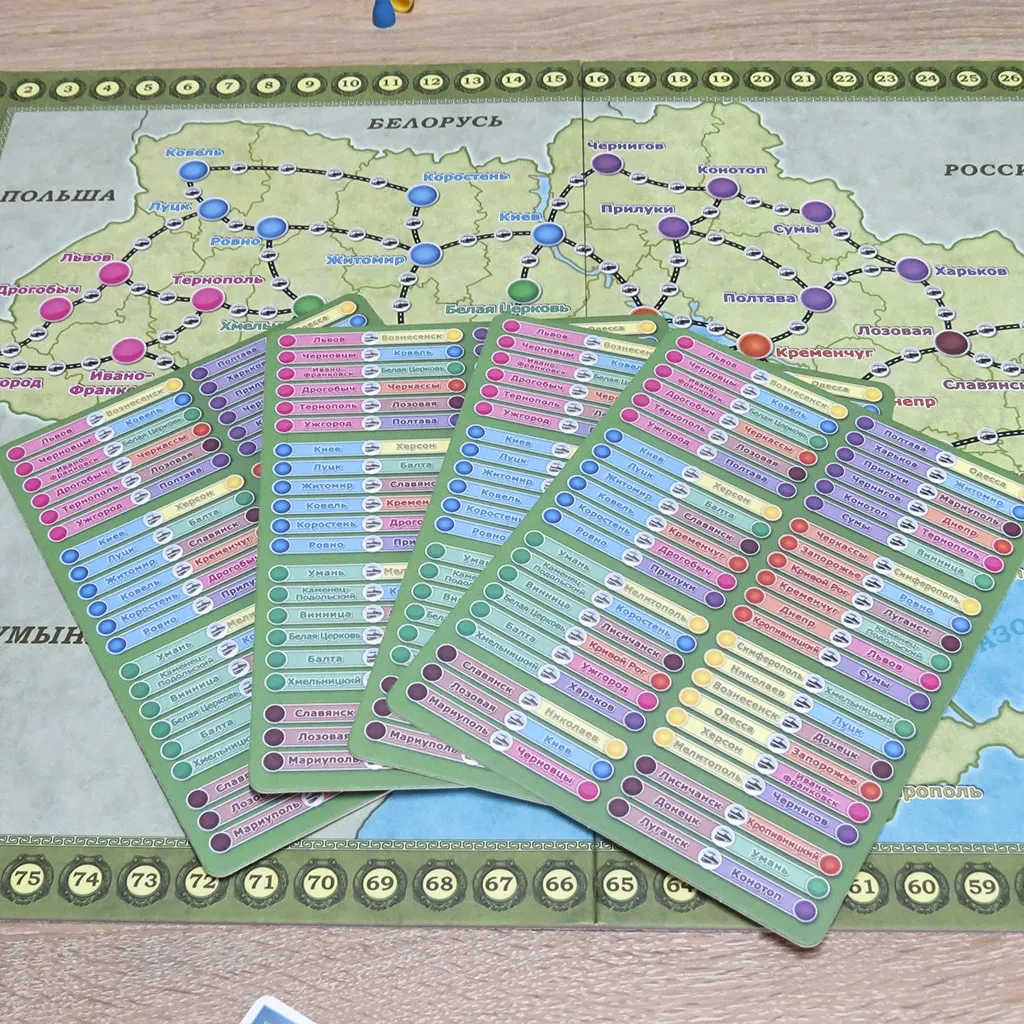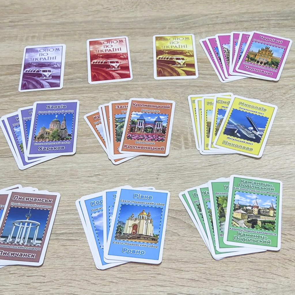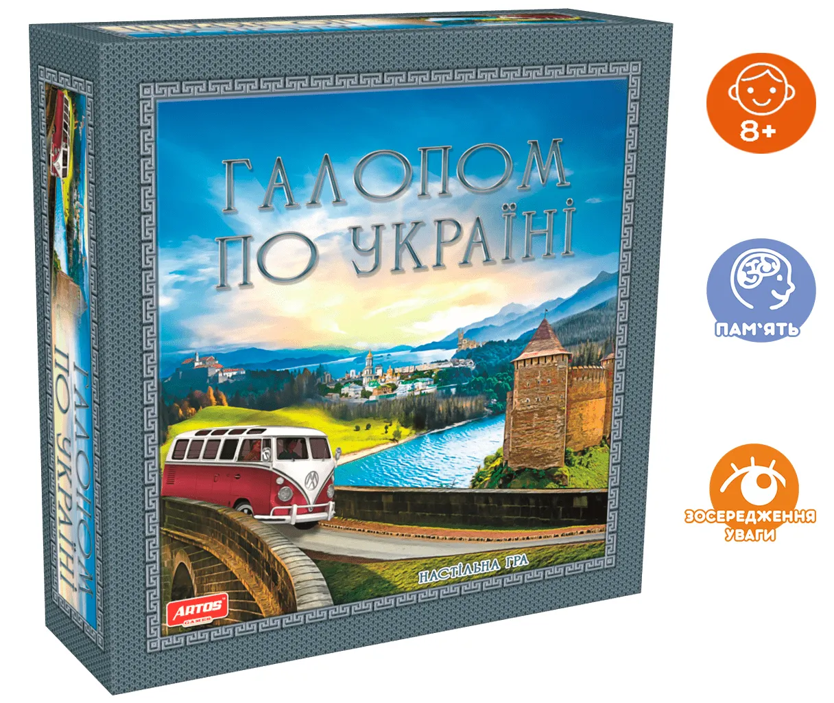 Настільна гра «Галопом по Україні» від українського виробника "Artos Games" дійсно відповідає своїй назві. Гравцям необхідно буде якнайшвидше пройти маршрут містами України, який вони самі складуть. При цьому вони будуть здійснювати переїзди між містами, а також рухатись автостопом від міста до міста. В результаті відвідувань міст України, які будуть у їхньому маршруті, гравці набиратимуть рейтингові очки мандрівника. Мета гри – набрати 100 очок в рейтингу мандрівника. Комплектація:- Ігрове двостороннє поле – 1 шт. - Гральні фішки – 4 шт.- Фішка-маркер – 4 шт.- Карточки міст – 42 шт.- Залізничні квитки – 16 шт.- Планшети рейсів на українській мові – 4 шт.- Планшети рейсів на російській мові – 4 шт.- Правила гри.