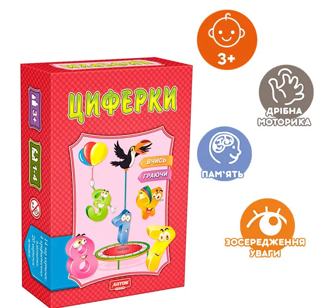 Настільна гра «Циферки» представляє собою дидактичну мозаїку для дітей. До неї входить 14 пар карточок, кожна з яких складається з двох частинок. На половинках зображені цифри, до яких потрібно підібрати пару з відповідною кількістю елементів. Також у грі присутні 4 арифметичних планшета з двадцятьма карточками-вставками. На них діти зможуть проводити прості арифметичні дії.
