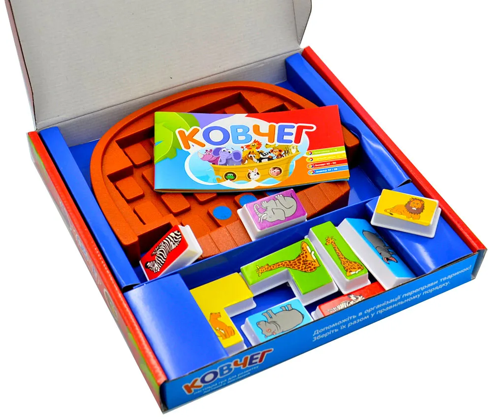 Ковчег - це нова логічна настільна гра від Fun Game Club.Ігрове поле імітує платформу-судно на якому буде розгортається головне ігрове подія - переправа тварин!10 звірів виконані у формі геометричних фігур, їх потрібно розміщувати на ігровому полі так, щоб всі інші тварини, по завершенню гри, помістилися на судні.Як саме буде йти гра і яку тактику обрати вирішувати Вам.В інструкції з правилами, можна знайти 48 завдань, де є 4 рівня складності, а також готові підказки, як збирається конструкція.