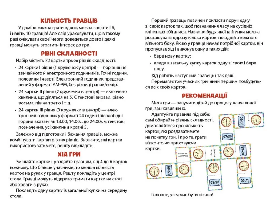 Ця гра із серії «Математичне доміно» допоможе дітям легко навчитися визначати час за звичайним та електронним годинником і надасть можливості проводити дозвілля в колі сім’ї або друзів не лише із задоволенням, а й з користю!