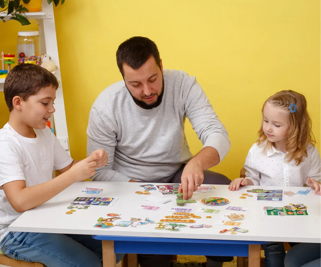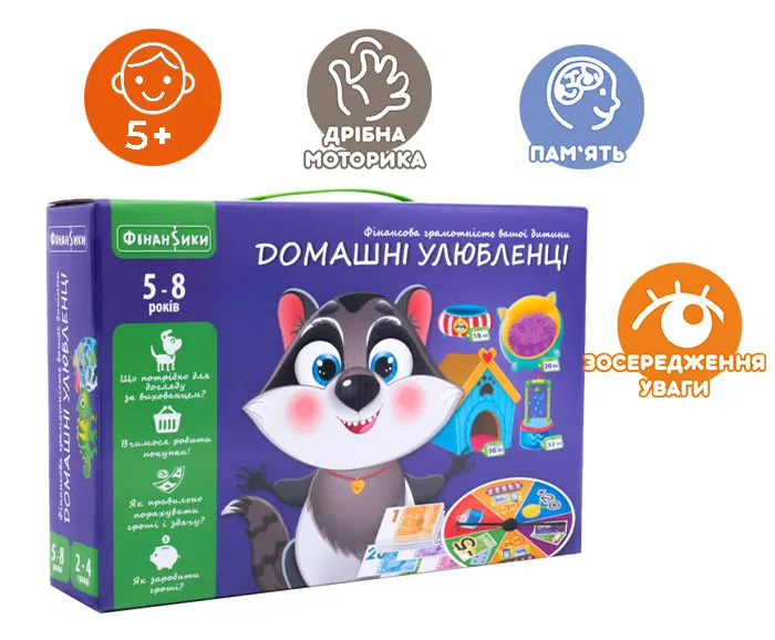 Домашні улюбленці такі різні! Всім їм потрібна турбота та увага. Вирушай в зоомагазин і купи для свого улюбленця усі необхідні речі! В процесі гри також навчайся розпоряджатися своїми фінансами, рахувати гроші і видавати здачу! Клич друзів, і збирайте атрибути для ваших вихованців наввипередки!Крутіть по черзі колесо фортуни, виконуйте необхідні дії та перемагайте!Гра тренує логічне мислення, уяву, пам’ять та комунікативні навики.Комплектація: 78 деталей, 40 паперових купюр, 4 списки покупок, 21 картка із завданням, 1 колесо фортуни, інструкція.