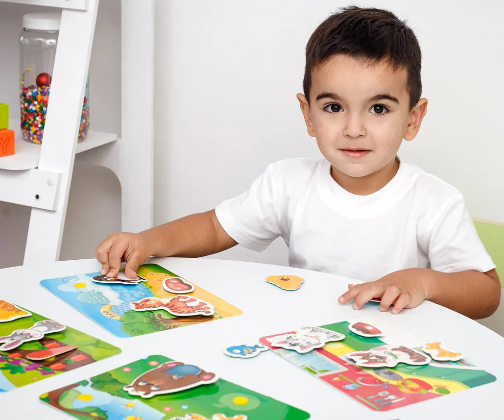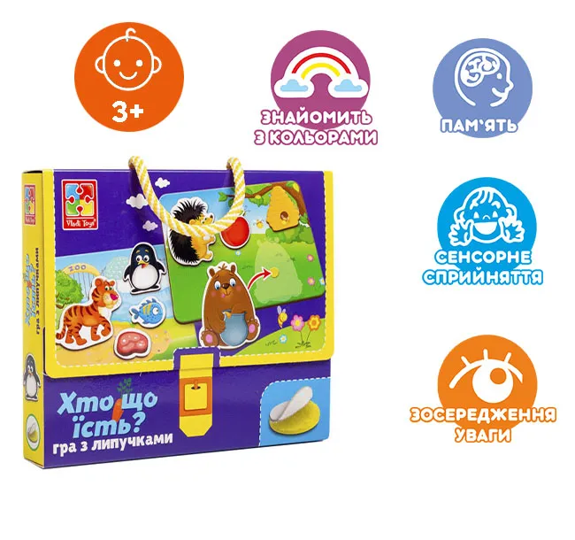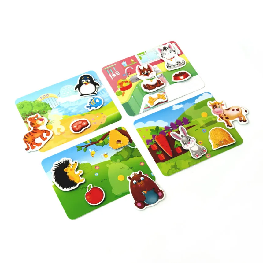 Вивчайте тварин та їхні улюблені смаколики в цікавій ігровій формі!Кріпіть фігурки за допомогою липучок до гральних полів у позначені місця.Наприклад, беремо картку із зображенням грядки. На ній росте морква. Хто полюбляє її їсти? Правильно, зайчик. Шукаємо фігурку із зображенням тваринки та кріпимо за допомогою липучок. Готово!В процесі гри малюк потренує логічне мислення, пам’ять, мовлення та дрібну моторику.Комплектація: 4 поля для гри, 16 деталей, 32 липучки, інструкція.