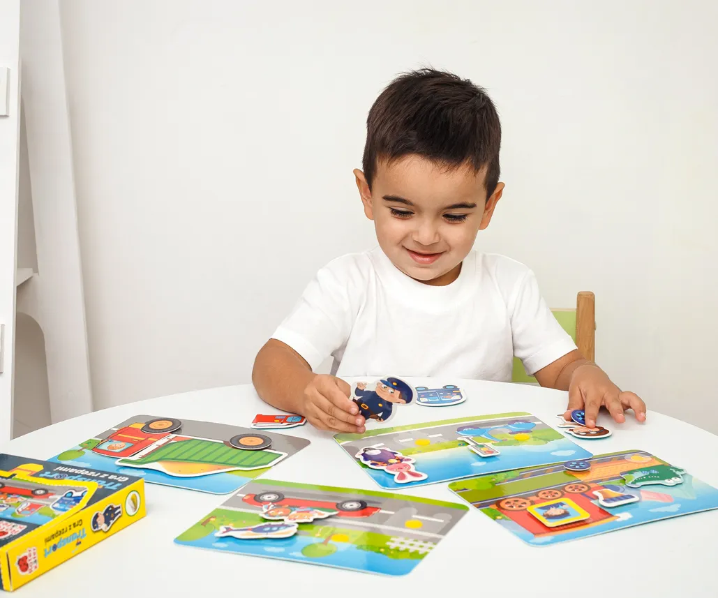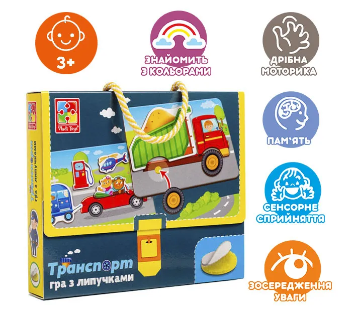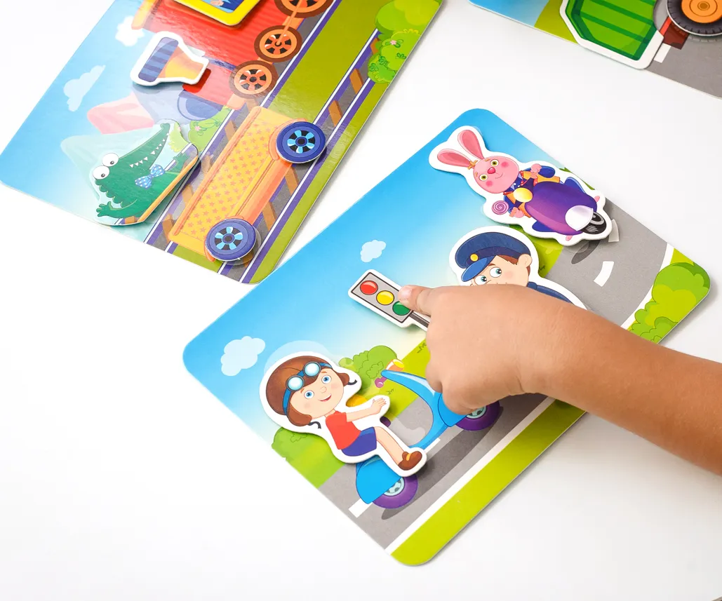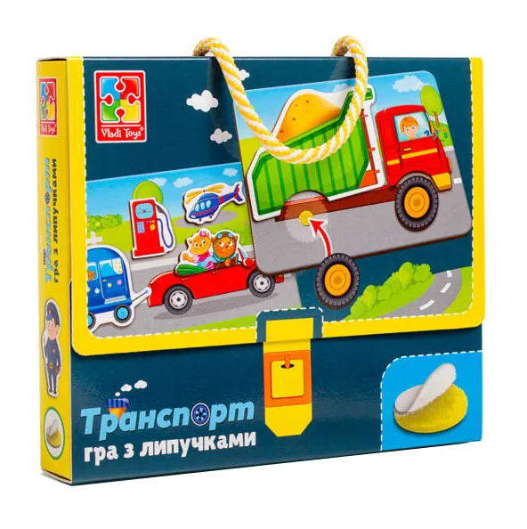 Вивчайте назви автомобілів та їхніх водіїв в цікавій ігровій формі!Кріпіть фігурки за допомогою липучок до гральних полів у позначені місця.Наприклад, беремо картку із зображенням дороги. Кріпимо основу вантажівки на липучках. Потім додаємо кузов. Готово!В процесі гри малюк потренує логічне мислення, пам’ять, мовлення та дрібну моторику.Комплектація: 4 поля для гри, 17 деталей, 34 липучки, інструкція.