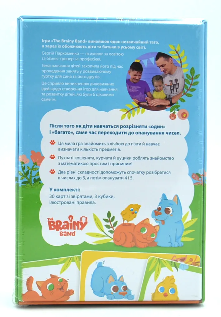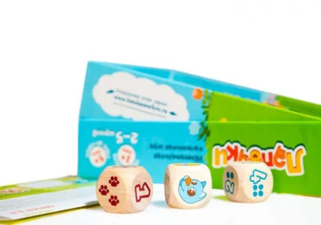 В коробці: 30 щільних карт з ламінуванням, 3 кубики, ілюстровані правила.