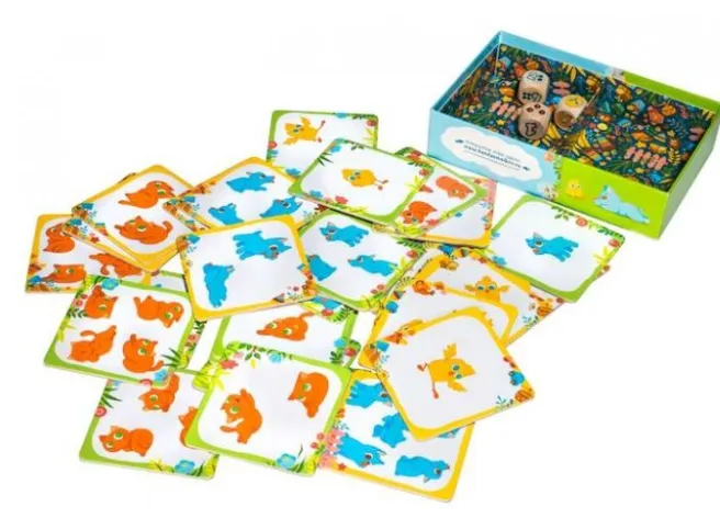 - Карти розкладаються на столі горілиць (9 карт при грі картами «до трьох», 15 - при грі картами «до п'яти»). Знадобиться кубик з тваринами і кубик з числами.