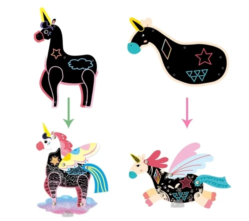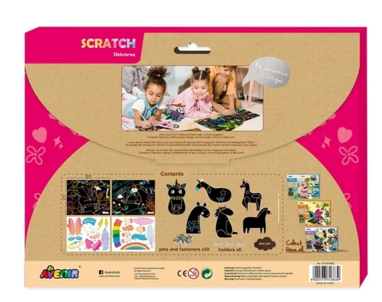 - дряпайте скретч-листи спеціальним олівцем, малюйте, розфарбовуйте деталі та створіть чарівних єдинорогів