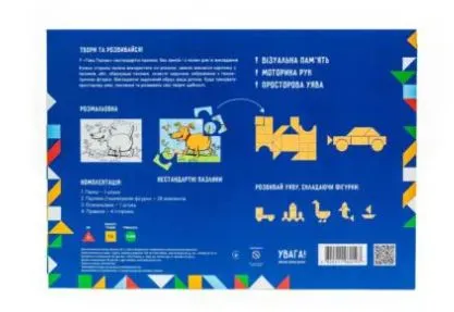 Комплектація:Папка – 1 штукаГеометричний пазл – 20 елементівРозмальовка – 1 штукаПравила