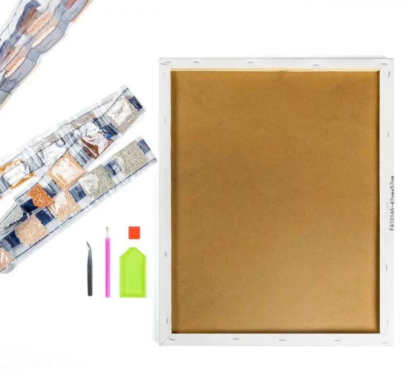 Комплектація: полотно із клейовим шаром; дерев'яний підрамник; акрилові стрази згідно з комплектацією набору; пінцет для страз; спеціальна ручка-стилус для роботи зі стразами; гель-клей; лоток для сортування страз.