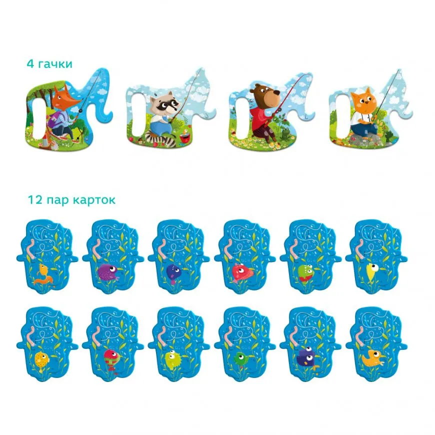 Гра: У свій хід гравець за допомогою гачка ловить дві рибки, зачіпаючи їх за хвостик, і показує всім. Якщо на них зображені однакові малюнки, він забирає собі обидві картки і може ловити наступну пару. Однак якщо зображення різні, гравець повертає ці картки на свої місця, а хід переходить до наступного учасника.