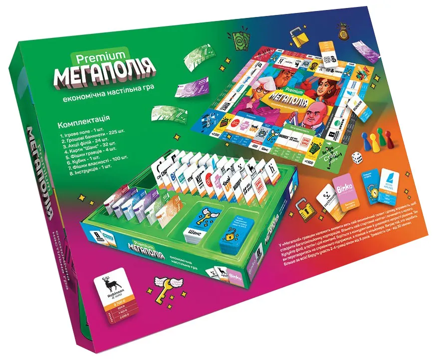 Комплектація:- Ігрове поле – 1 шт.;- грошові банкноти – 225 шт.;- акції філій – 24 шт.;- Карти "Шанс" - 32 шт.;- фішки гравців – 4 шт.;- Кубик – 1 шт.;- фішки власності – 100 шт.;- Інструкція – 1 шт.