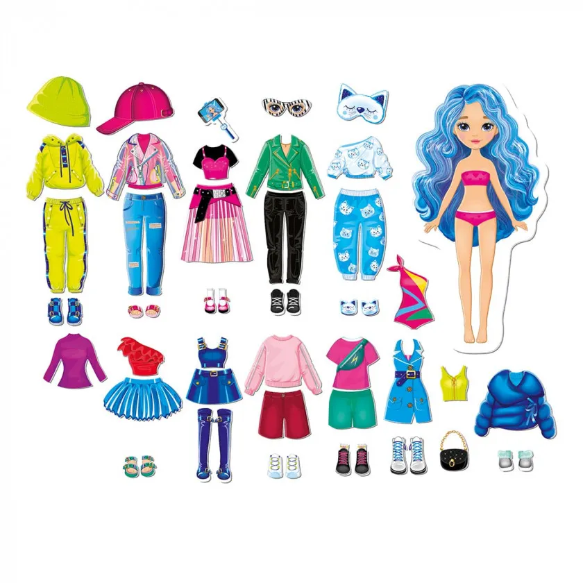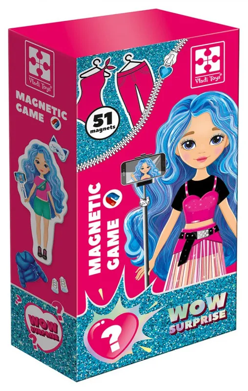 Знайомтеся з нашою героїнею! Вона відома блогерка. Крім створення контенту вона любить вигадувати цікаві образи. У її гардеробі можна знайти різноманітні елементи одягу як звичайні, так і святкові. Підбирайте для дівчинки магнітний одяг і кріпіть до ляльки-основи. Скористайтеся книжкою-інструкцією, щоб дізнатись, які готові костюми можна підібрати. А також фантазуйте, міняйте магніти місцями та створюйте неповторні образи разом із настільною грою-сюрпризом Vladi Toys Magnetic Game 51 магніт.