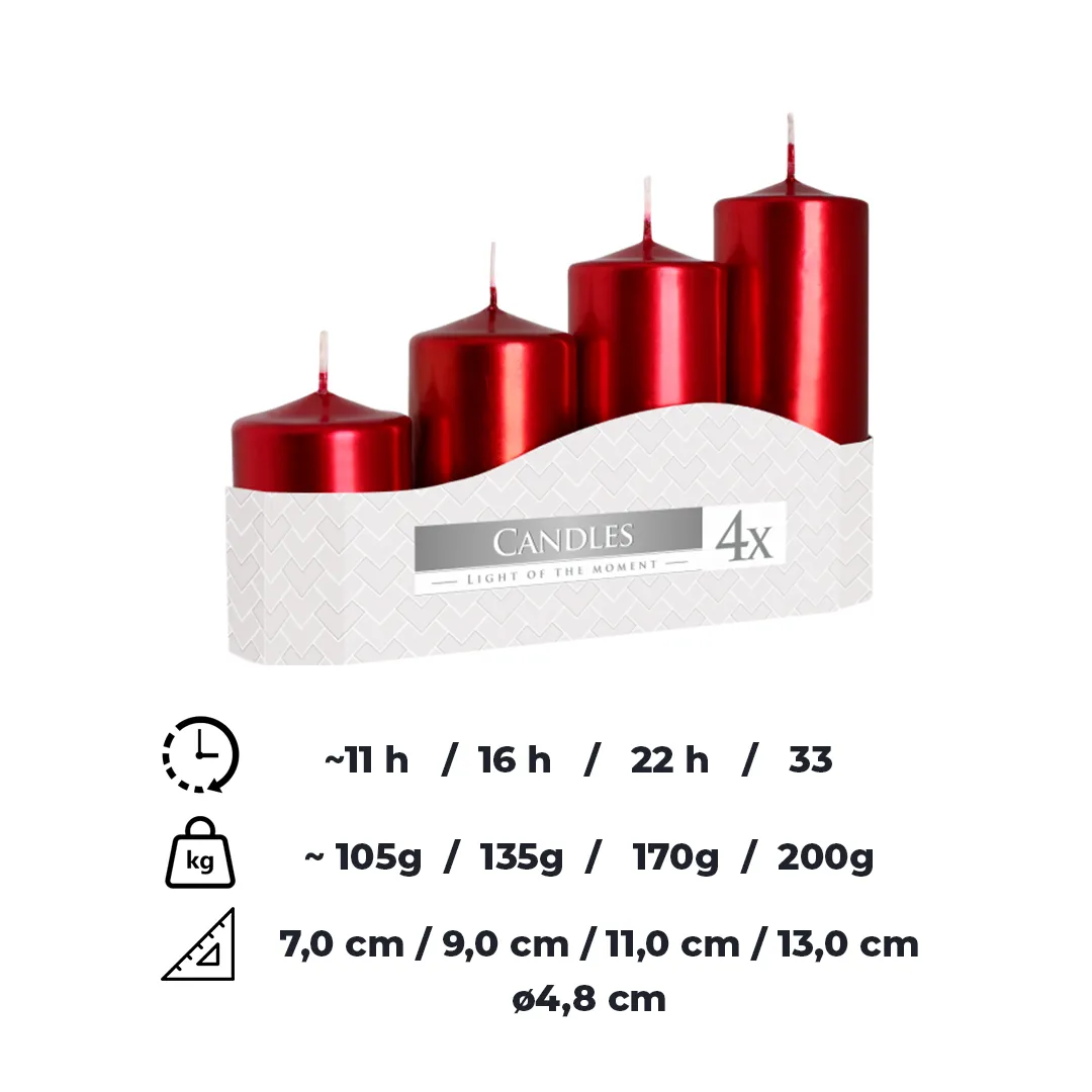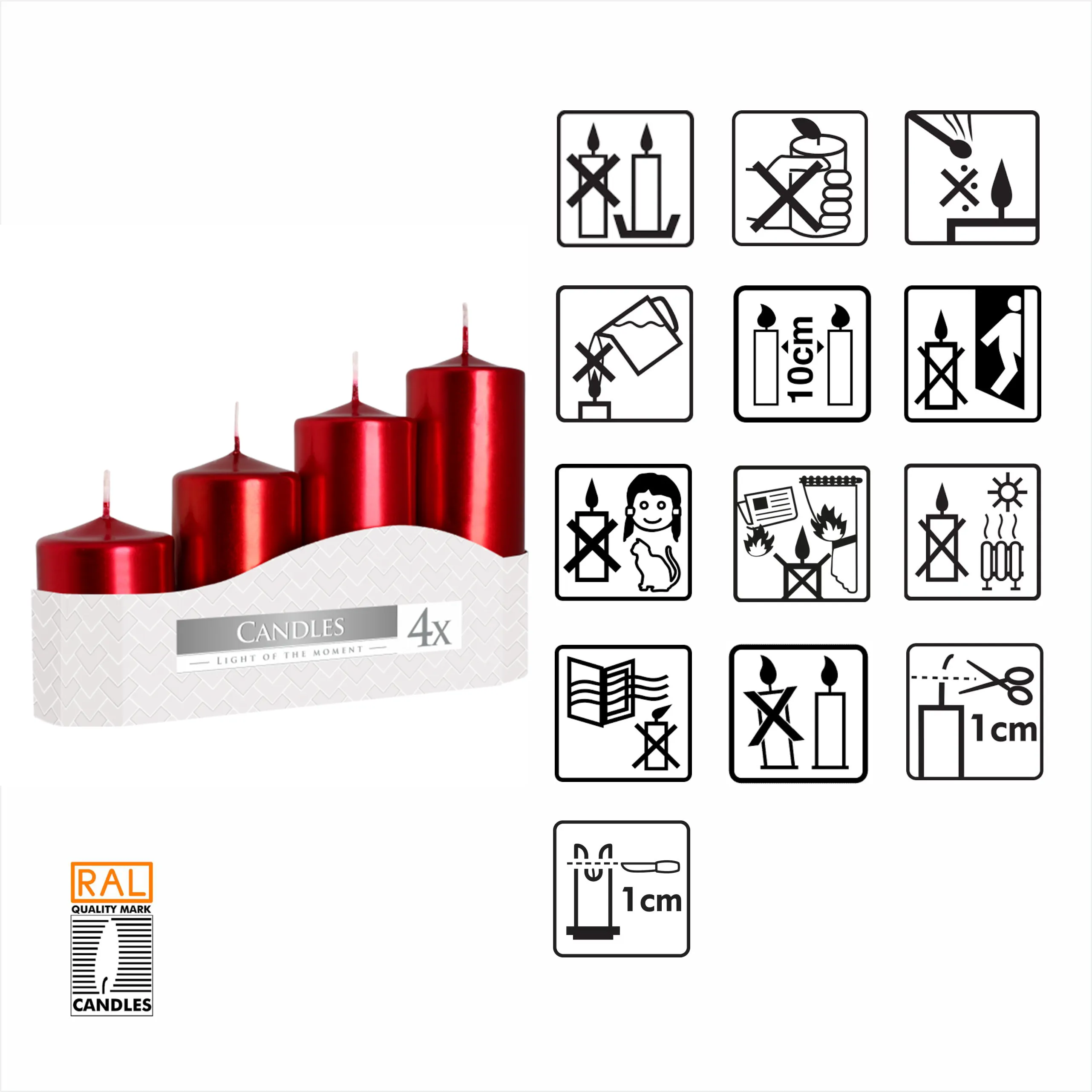 Набір із 4 циліндричних парафінових свічок «Bispol» – неодмінно має стати атрибутом Вашої новорічної оселі. Чотири естетично привабливих свічки різного розміру створять казковий інтер’єр у Вашому домі. Кожен член родини може обрати свою і знайти їй місце на власний смак. Важливо, що ці парафінові свічки вироблені з високоякісного матеріалу, тому не містять токсичних речовин, що виділяються при горінні й абсолютно нешкідливі для здоров'я, вони не стікають і не коптять.