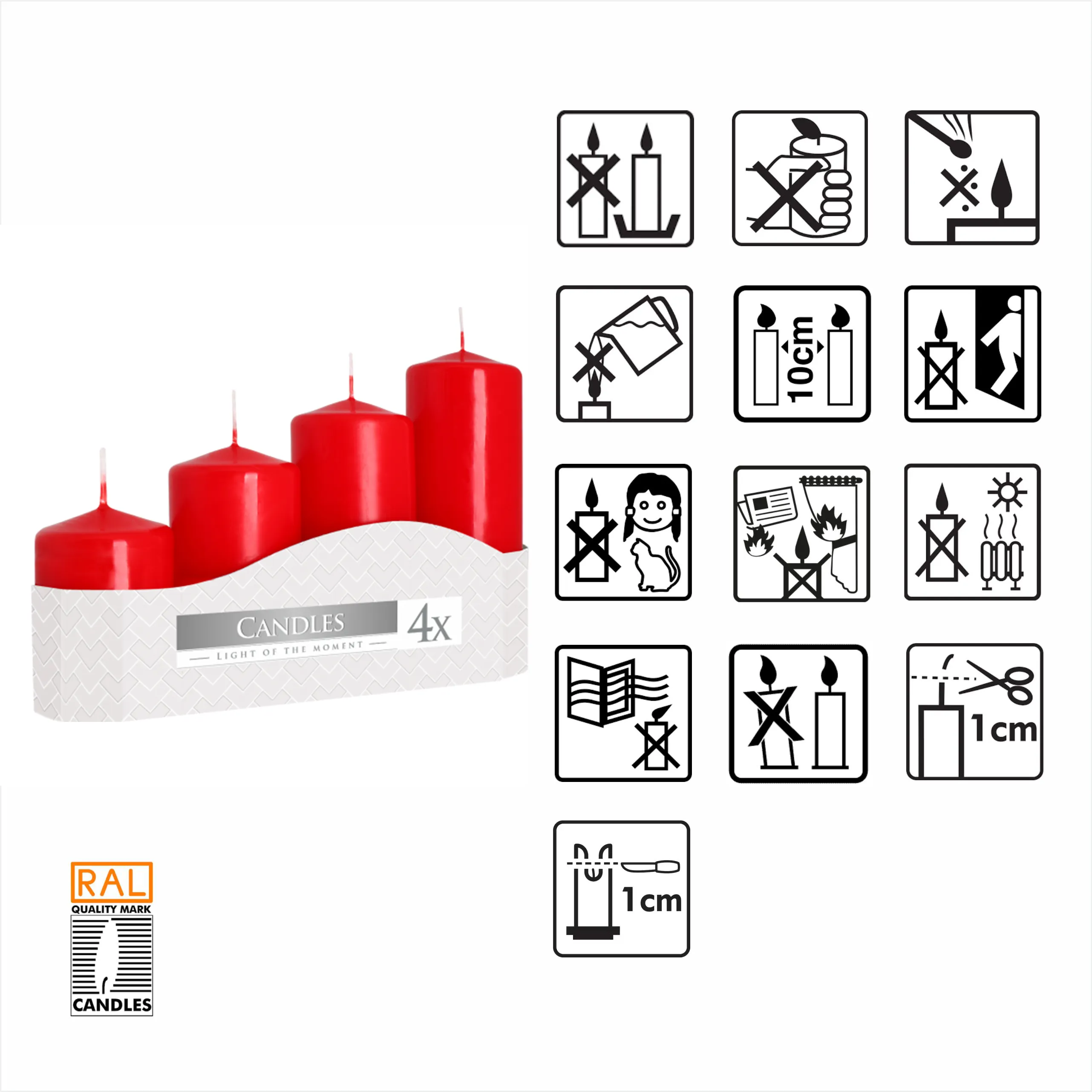 Набір із 4 циліндричних парафінових свічок «Bispol» – неодмінно має стати атрибутом Вашої новорічної оселі. Чотири естетично привабливих свічки різного розміру створять казковий інтер’єр у Вашому домі. Кожен член родини може обрати свою і знайти їй місце на власний смак. Важливо, що ці парафінові свічки вироблені з високоякісного матеріалу, тому не містять токсичних речовин, що виділяються при горінні й абсолютно нешкідливі для здоров'я, вони не стікають і не коптять.