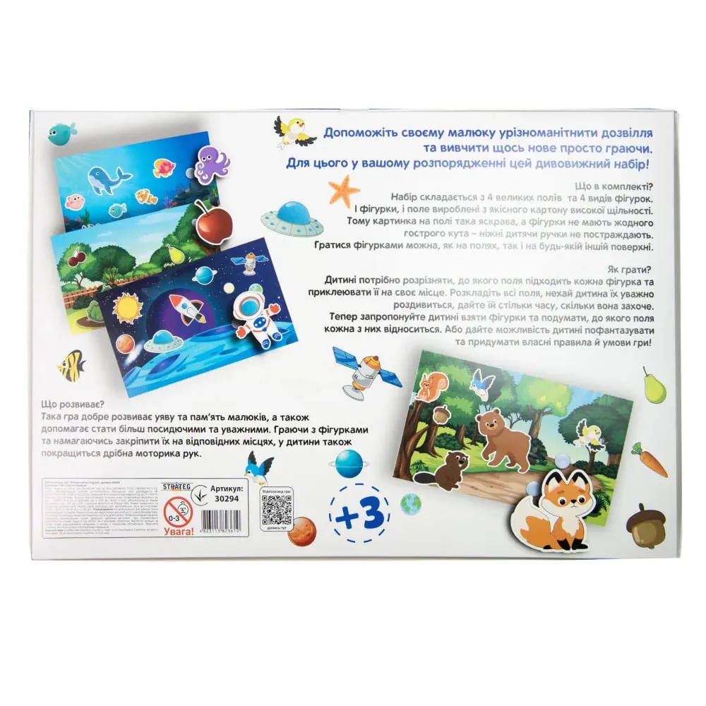 Як грати? Розкладіть всі поля, нехай дитина їх уважно роздивиться, дайте їй стільки часу, скільки вона захоче. Тепер запропонуйте дитині взяти фігурки та подумати, до якого поля кожна з них відноситься. Або дайте можливість дитині пофантазувати та придумати власні правила та умови гри!