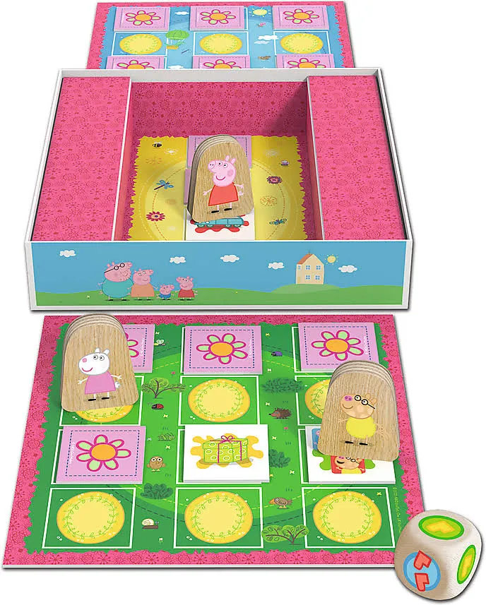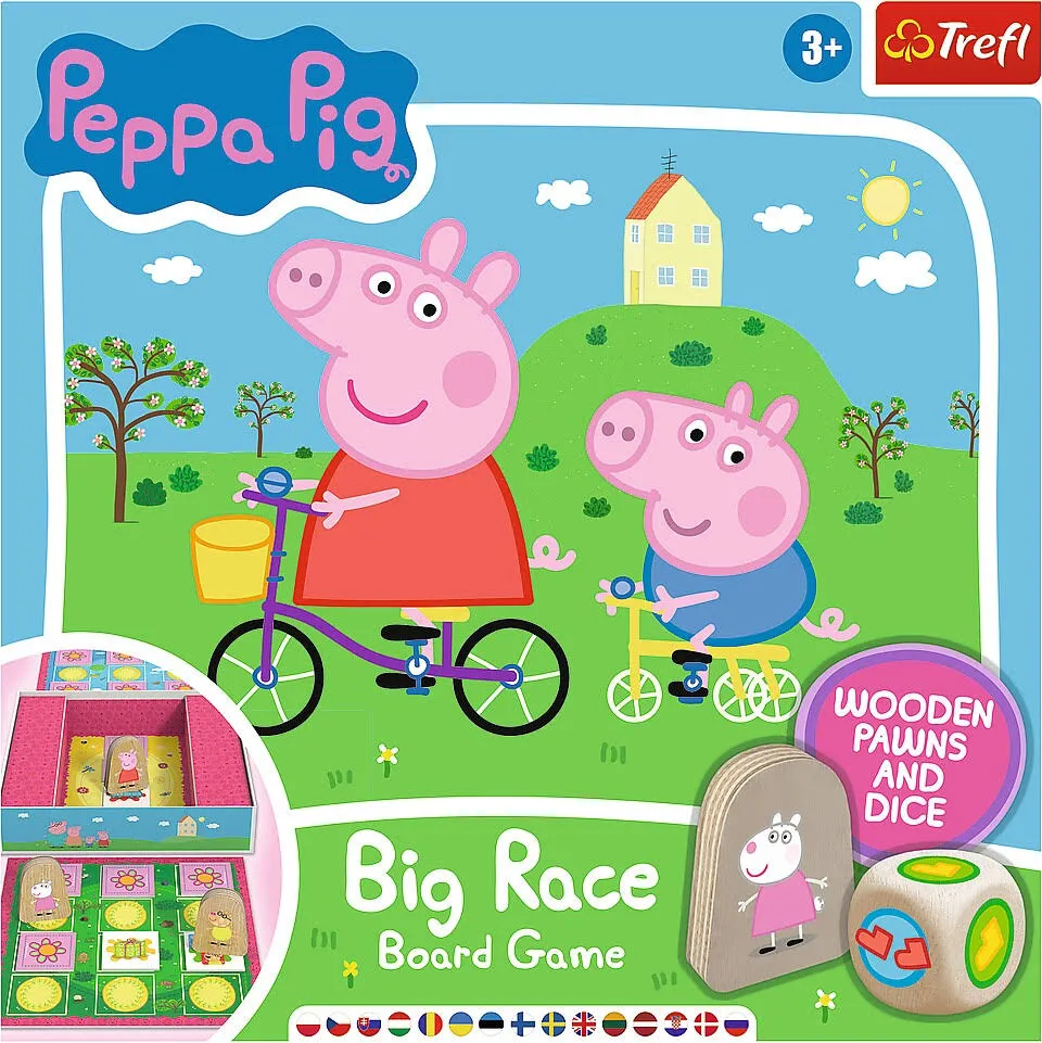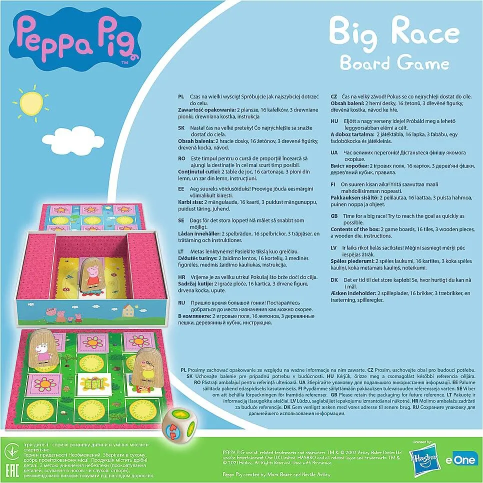 Приготуйтеся до великих перегонів! У настільній грі Великі перегони (Big Race) ви будете змагатися разом з іншими гравцями, щоб дістатися до фінішу. По дорозі на гравців також чекають сюрпризи. Перейдіть по середньому мосту, пам'ятаючи, що у вас мало місця. Дістанься до місця призначення якнайшвидше і отримай задоволення від гри Велика гонка Свинка Пеппа (Big Race Peppa Pig).