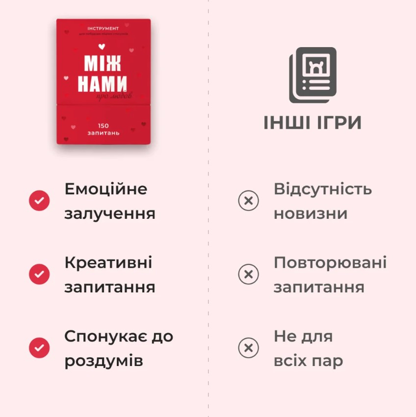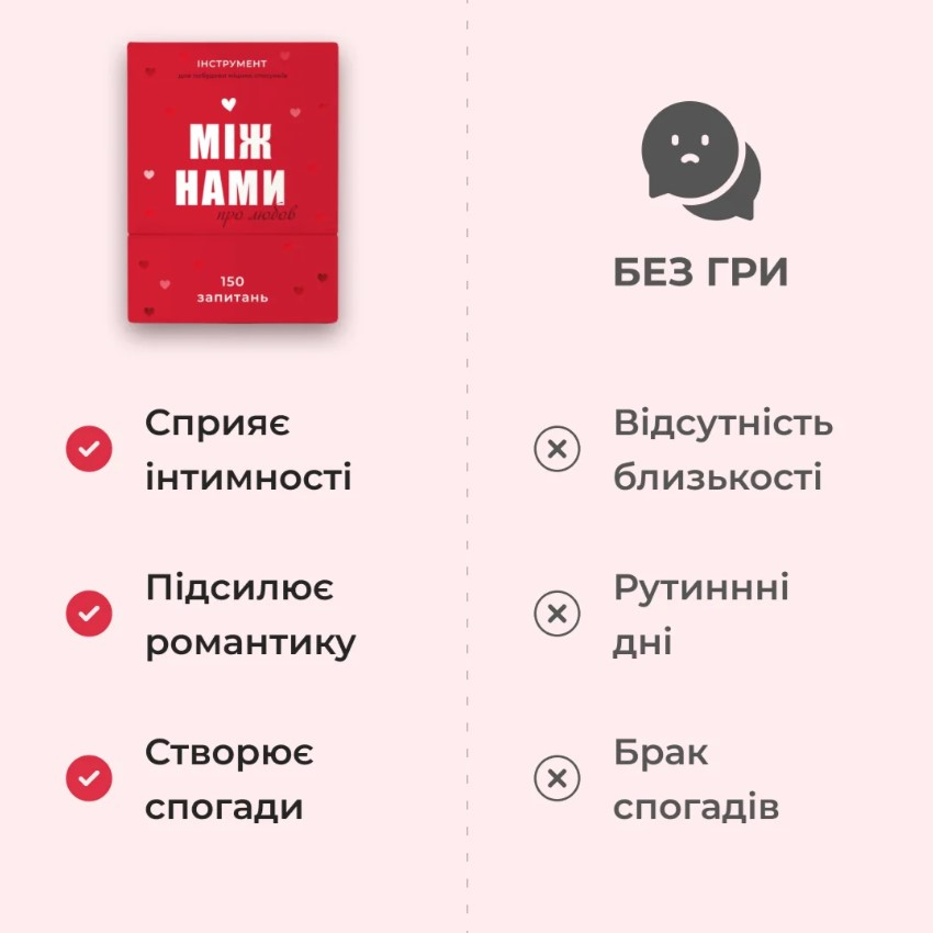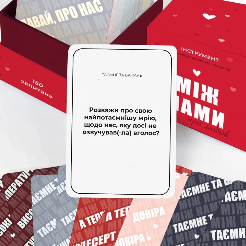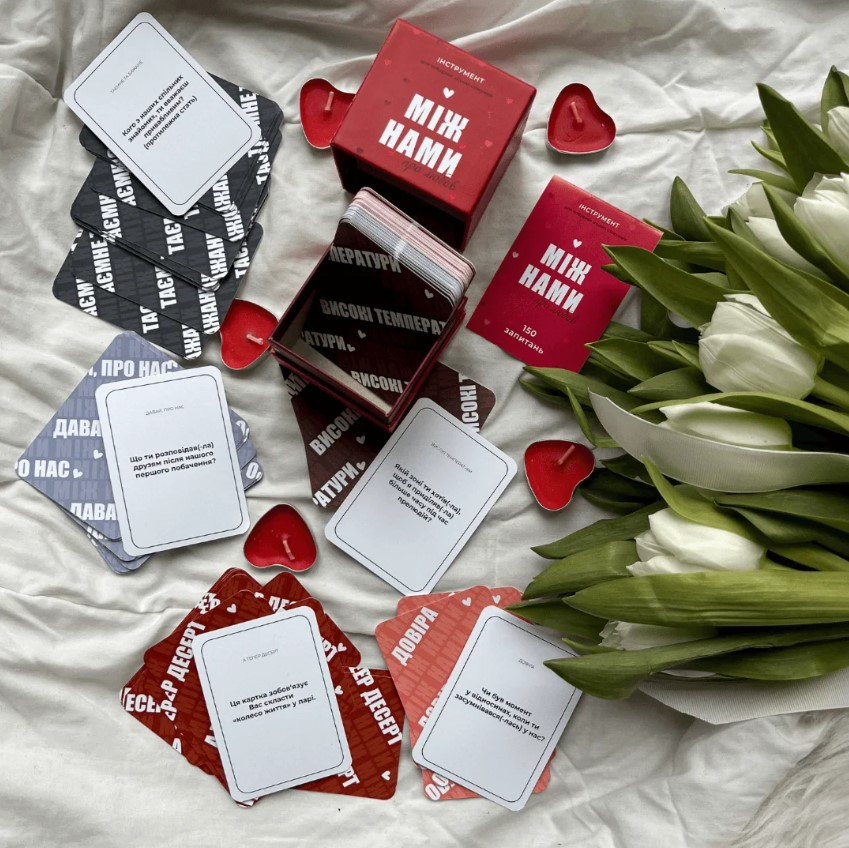 Ця гра розроблена для пар та містить 150 глибоких питань, що допоможуть зануритися у ваші стосунки. Ви поділитися зі своєю другою половинкою мріями та планами, сексуальними фантазіями та страхами. А також, кумедними спогадами та надіями.