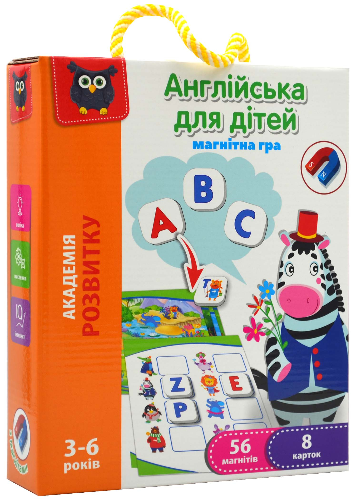 Магнітна гра допоможе вашій дитині весело вивчити букви англійського алфавіту, запамʼятати їхні назви та проілюструвати вживання букв у словах. Крім того, це збагатить словниковий запас - малюк вивчить назви тварин англійською мовою. Гра позитивно впливає на розвиток уваги, памʼяті, логічного таабстрактного мислення.Розглядайте разом з дитиною букви; відпрацьовуйте фонетику, акцентуючи вимову кожної літери алфавіту; складайте разом слова. На картках ви знайдетерізноманітні завдання, які допоможуть не лише закріпити знання, а й сформувати базові навички.