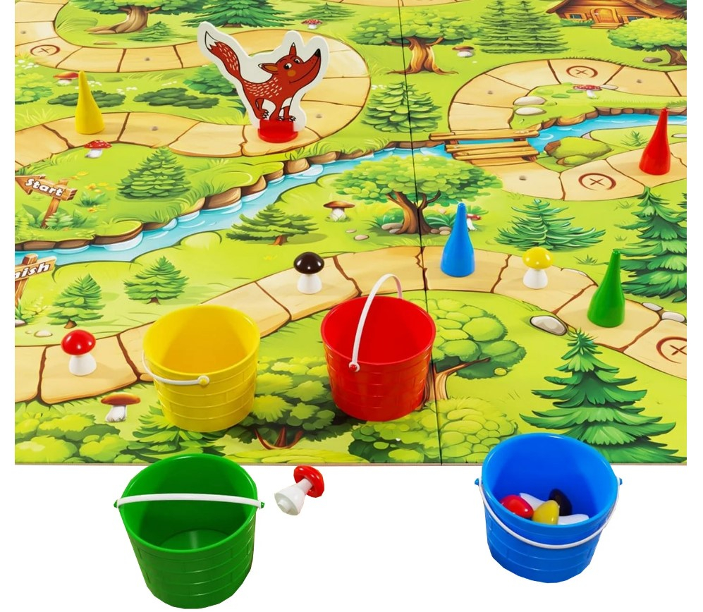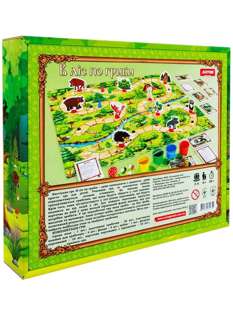 Комплектація: Ігрове поле - 1шт., пластикові грибочки - 26 шт., пластикові кошики для грибочків - 4 шт., фішки - 4 шт., кубик - 1 шт., фігурки персонажів - 10 шт., карточки персонажів з віршиками - 10 шт., правила гри.