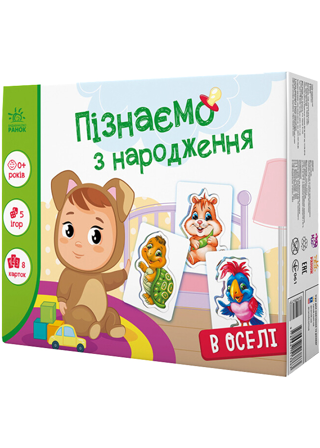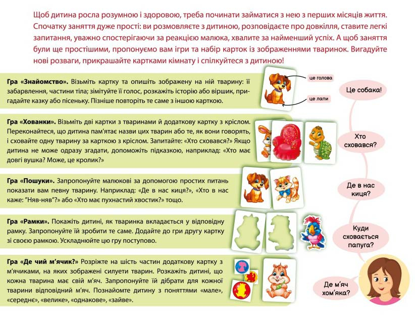 Немовля потребує спілкування з перших же днів. Щоб малюк ріс розумним і здоровим, грайте з ним! Ігри та набір карток «В оселі» спрямовані на всебічний розвиток дитини з перших місяців життя. В ході занять маля познайомиться зі свійськими тваринками - мешканцями оселі, а також засвоїть поняття «мале», «середнє», «велике», «однакове», «зайве». Встигніть якомога корисніше використати період, поки малюк сприймає все нове найінтенсивніше!Переваги:П'ять сюжетних ігор для немовлят зі свійськими тваринками надають можливість: 1. займатися з дитиною в будь-який час і в будь-якому місці, 2. ефективно витрачати мінімум часу для гармонійного розвитку малюка, 3. використовувати цупкі картки як розвиваючий декор для дитячої кімнати, 4. граючи, спілкуватись з дитиною.