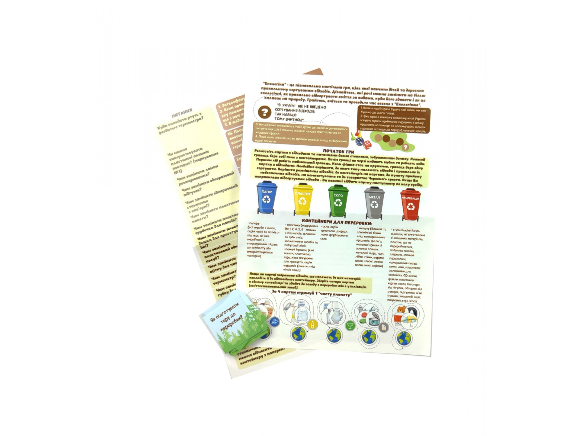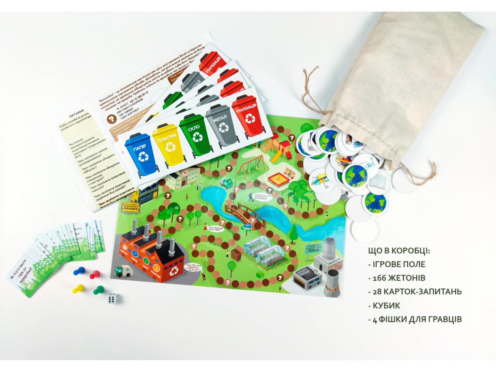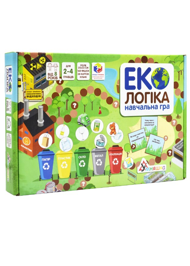 "Екологіка" - це пізнавальна настільна гра, ціль якої навчити дітей та дорослих правильному сортуванню відходів та усвідомленому споживанню. Дізнайтесь як правильно поділити сміття за видами, які види сміття переробляються, а які ні, які речі можете замінити на більш екологічні, куди здавати відходи і як це впливає на природу.1 місце в конкурсі "Краща іграшка-2021" в категорії настільних ігор!Що в коробці:- Ігрове поле 25Х33 см- Картки із запитаннями: 28 шт.- Фішки-жетони: 166 шт у торбинці- Кубик - Фішки для гравців 4 шт. (у паперовому конверті)- Інструкція- Аркуш з питаннями та відповідями до них.Для дітей від 10 років.