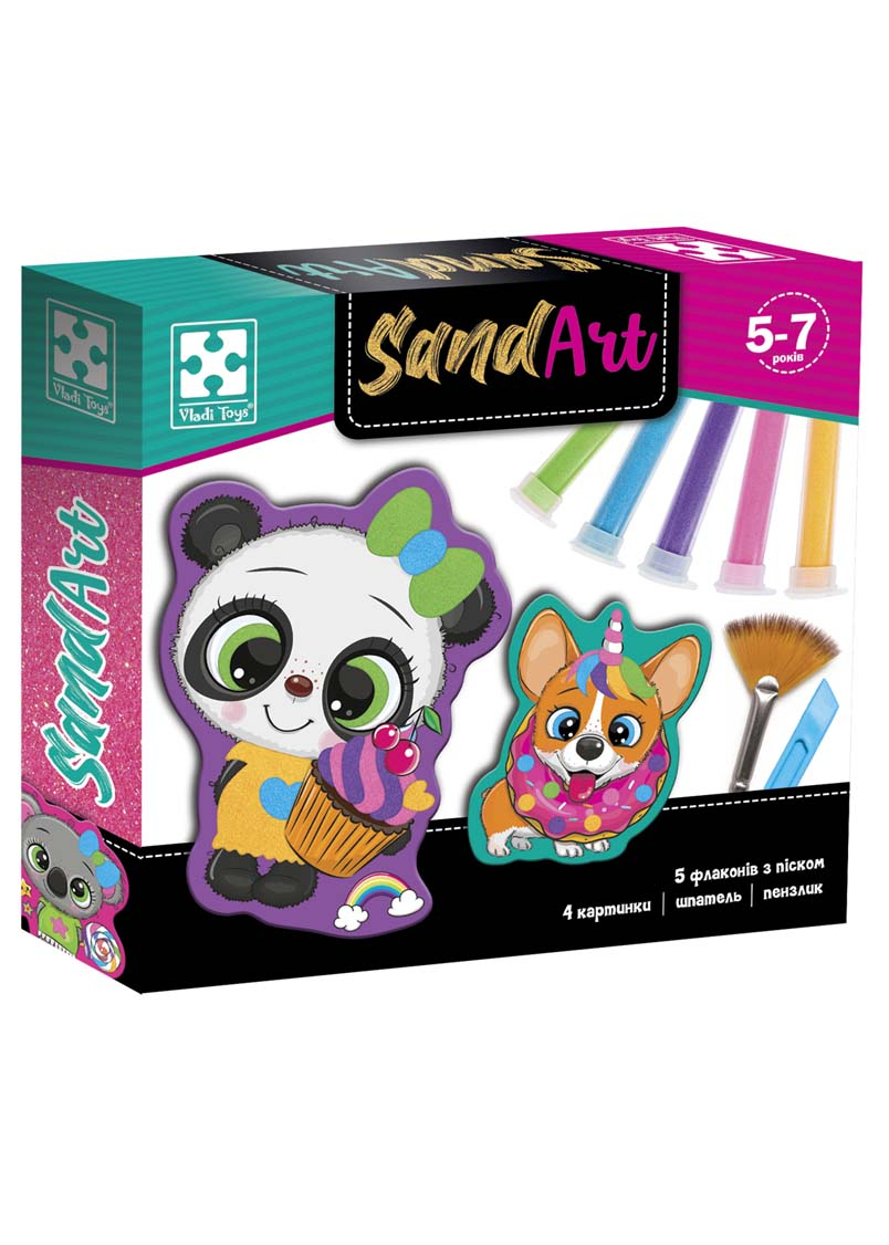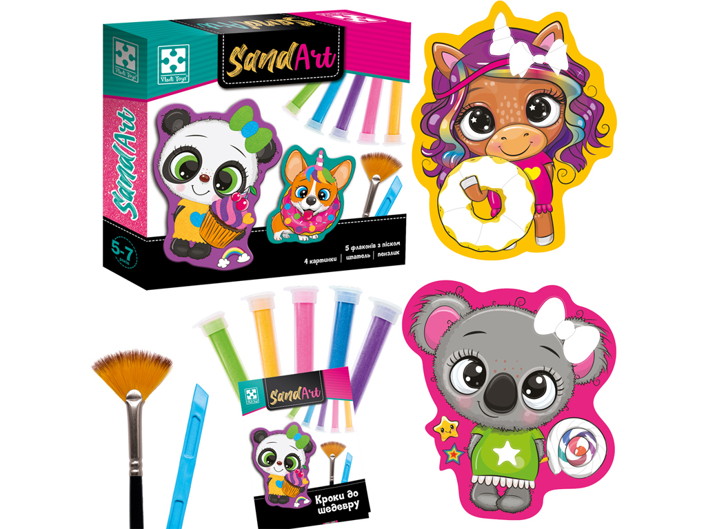 Включає - 5 флаконів з піском, 4 картинки, шпатель, пензлик, творчий посібник.