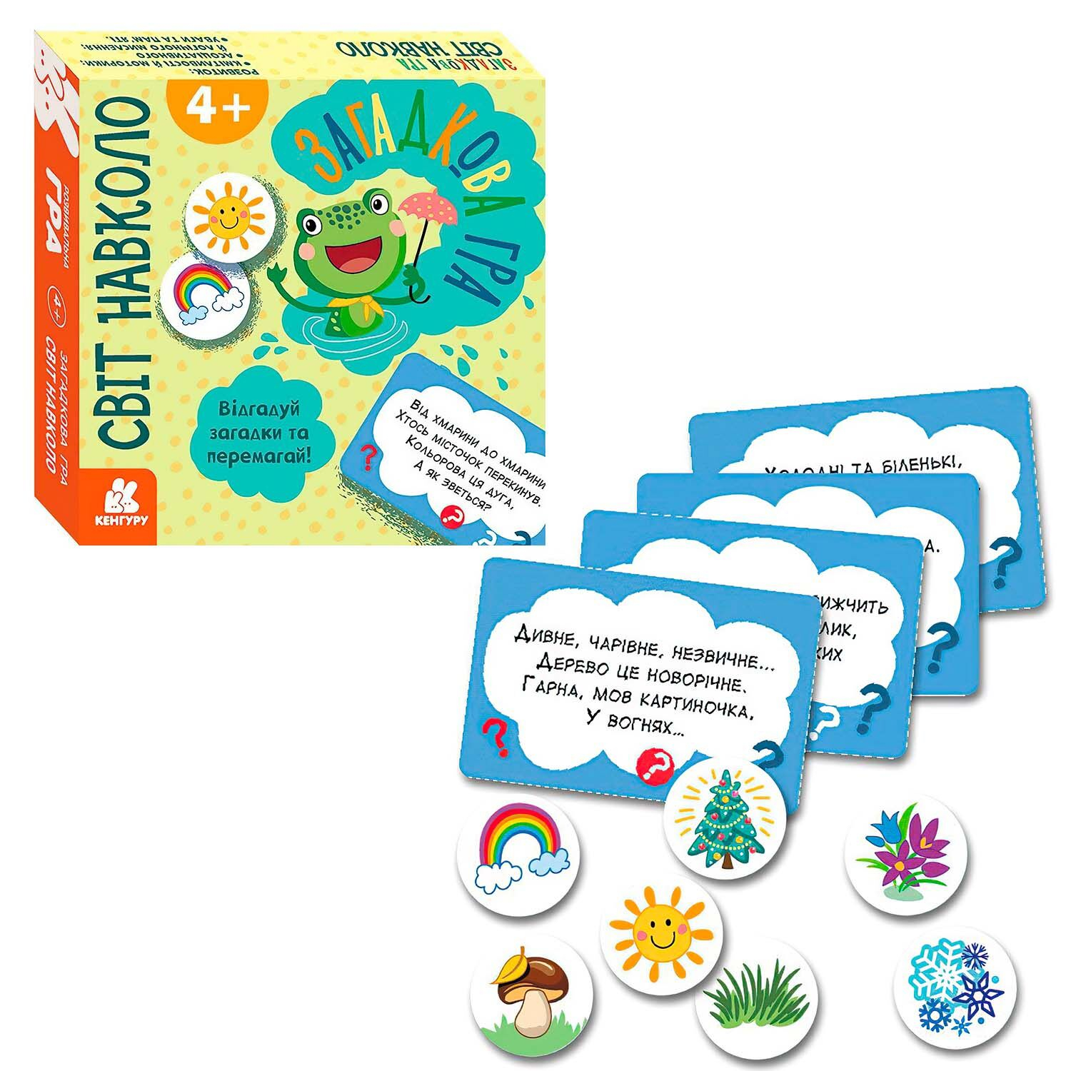 Кожний набір містить картки та фішки. На кожній картці є віршована загадка, яку дітям пропонується розгадати. І це ще не все! Дитина повинна не лише дати правильну відповідь, а й відшукати фішку з відповідним зображенням.