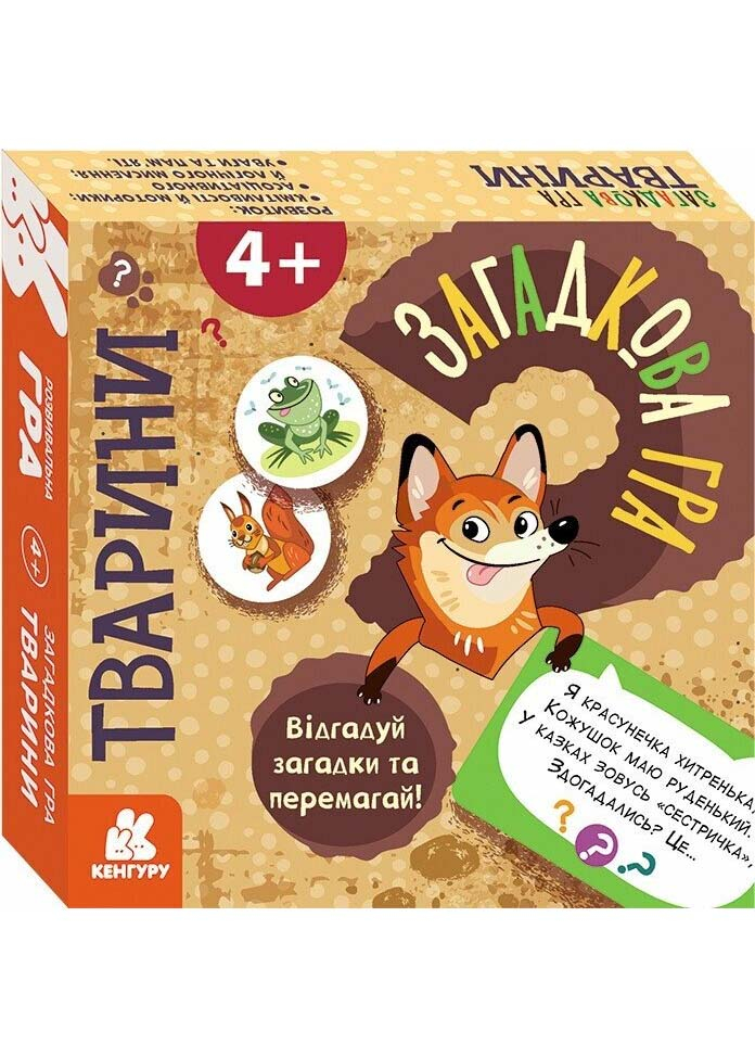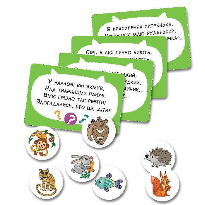Не секрет, що майже всі люблять загадки! Тож ми створили гру, яка зацікавить малюків і допоможе дорослим організувати для них захопливе й корисне дозвілля. Кожний набір містить картки та фішки. На кожній картці є віршована загадка, яку дітям пропонується розгадати. І це ще не все! Дитина повинна не лише дати правильну відповідь, а й відшукати фішку з відповідним зображенням.