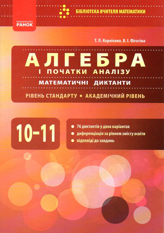 Посібник, складений відповідно до чинної програми з математики (11-рі' школа), являє собою збірник математичних диктантів для 10 і 11 класів і мс бути використаний для організації навчання на рівні стандарту й академічне рівні.