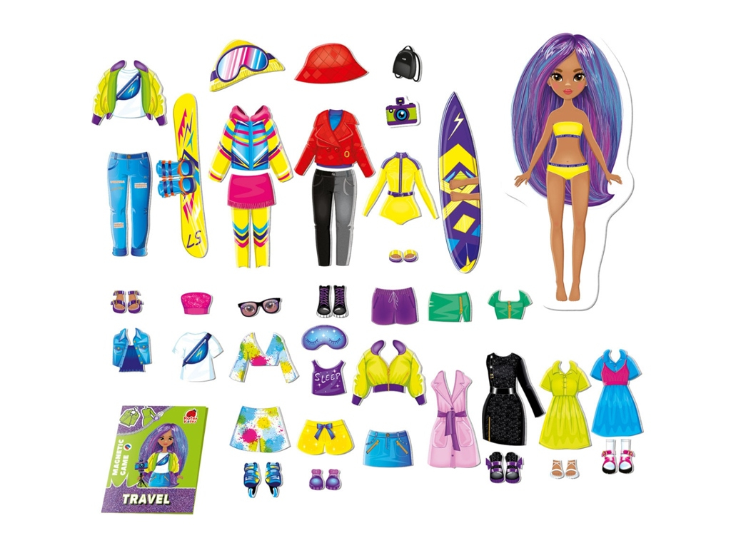 Зустріть нашу чарівну мандрівницю. Створіть цікаві образи за допомогою магнітного одягу. Вибирайте із різноманітних елементів, як звичайних, так і святкових. Змінюйте магніти місцями, щоб створювати свої унікальні модні образи, розвиваючи свою фантазію!