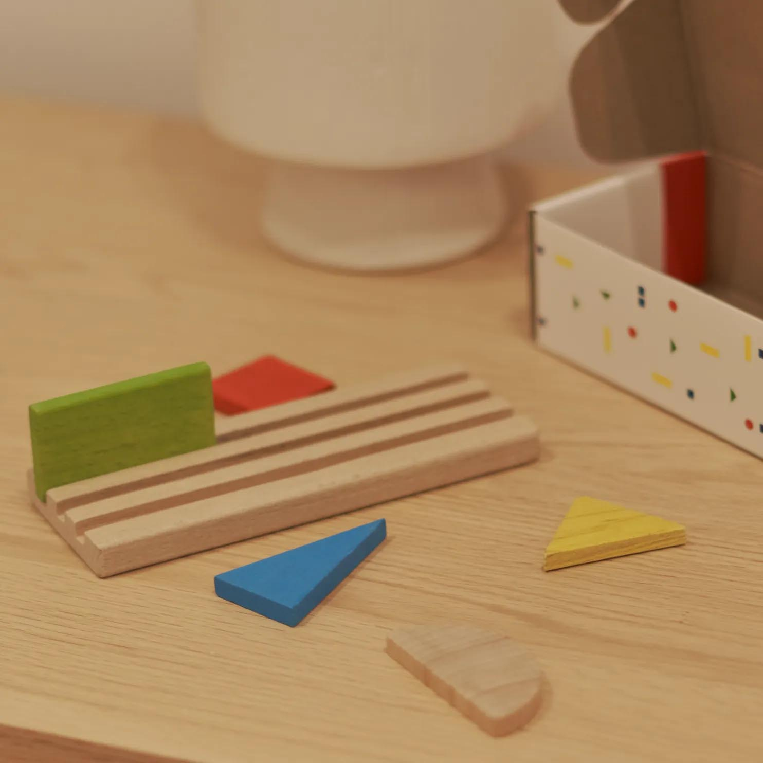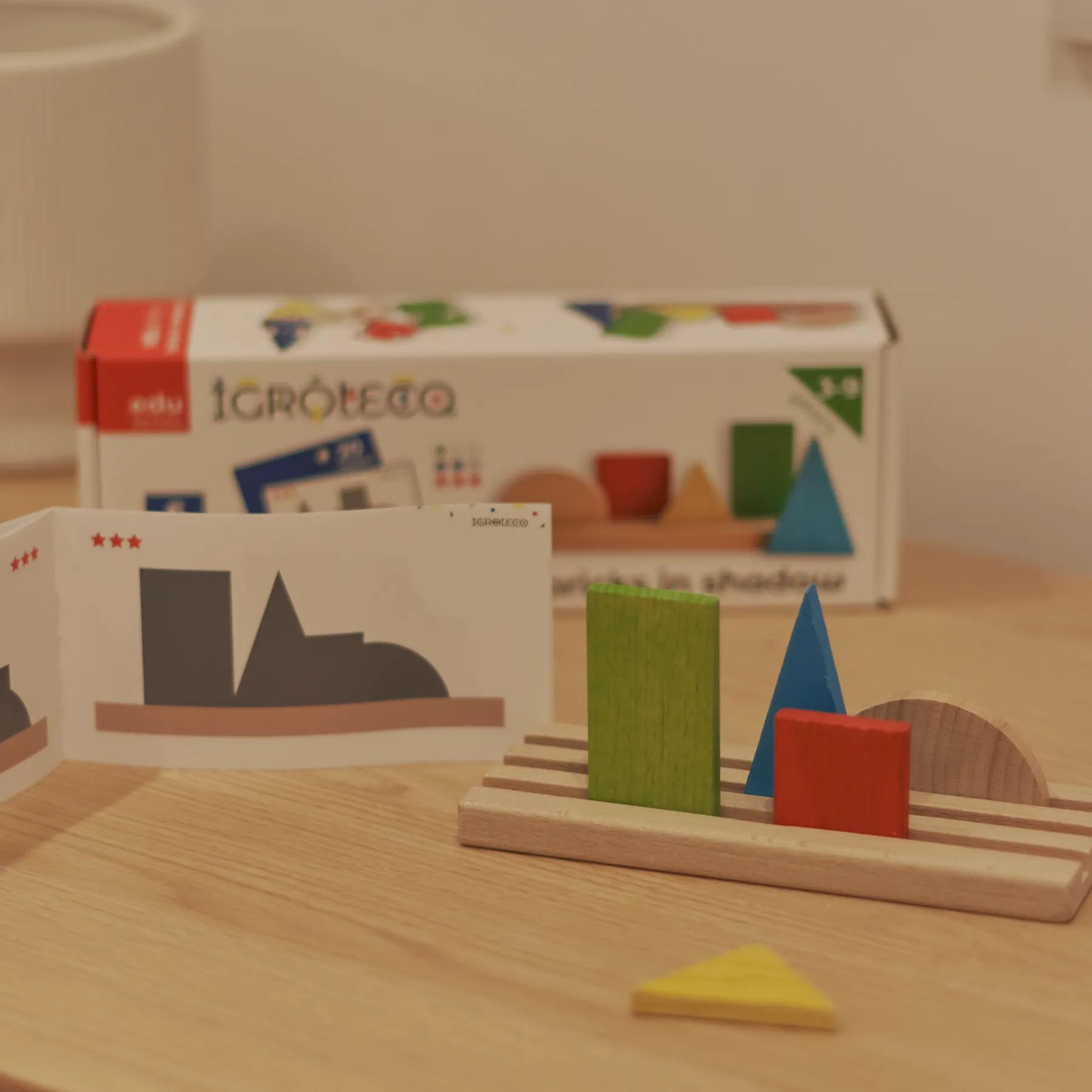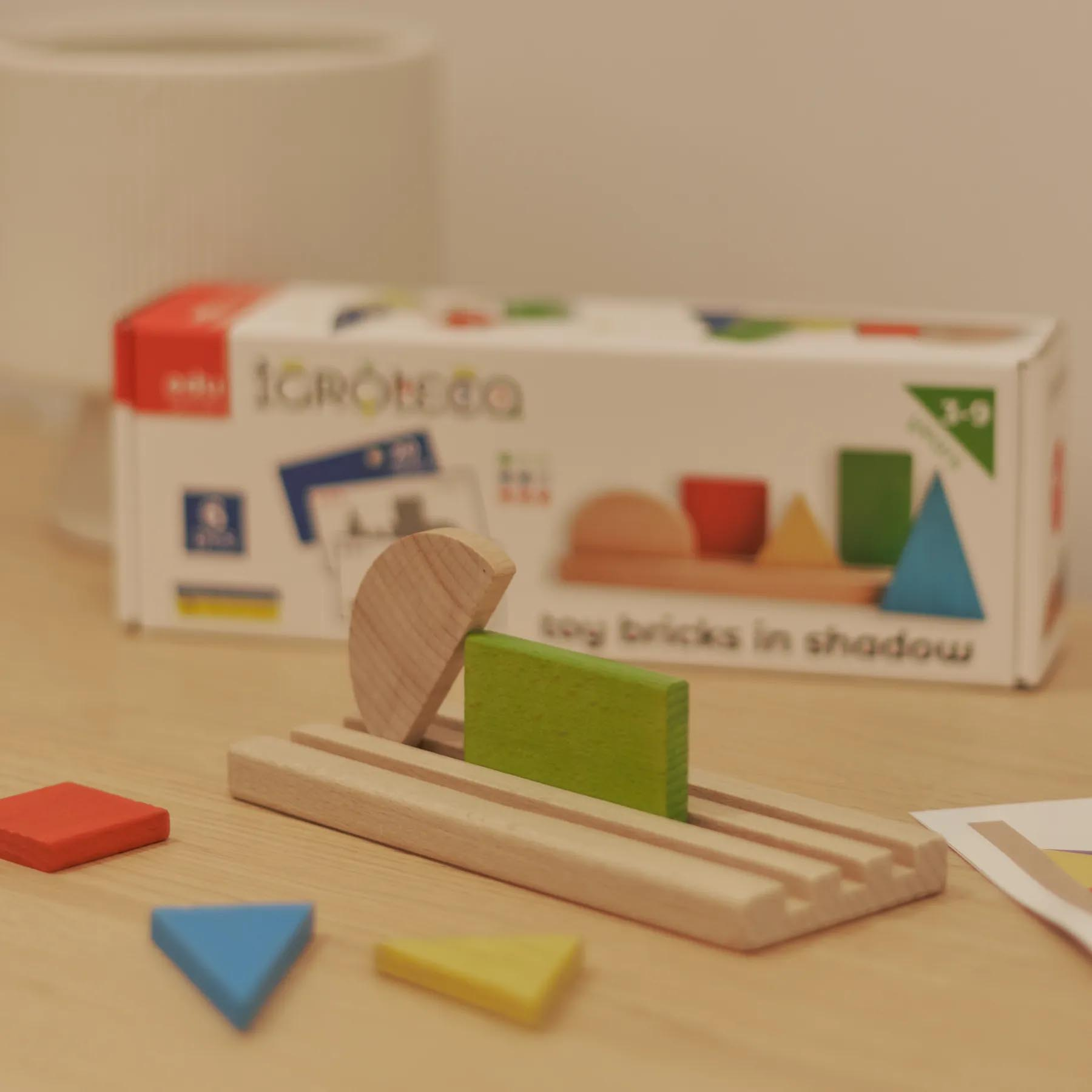 Фігури і тіні – це чудова іграшка, яка стимулює розвиток окоміру та логічного просторового мислення у дітей! У наборі ви знайдете 5 різнокольорових геометричних фігур: червоний квадрат, салатовий прямокутник, натурального кольору півколо та два трикутники – жовтий менший і синій більший. Також у комплекті є дошка-основа з трьома повздовжніми пазами.