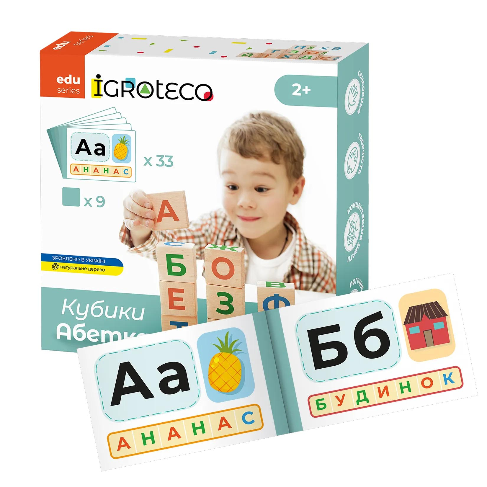 У наборі ви знайдете 9 кубиків розміром 35х35 мм, а також книжечку зі словами на кожну букву.