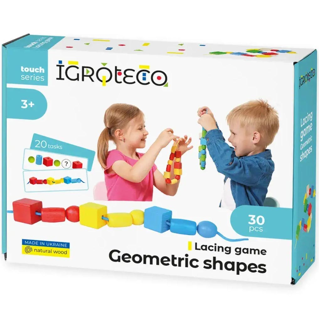 Нанизуючи на шнурки кольорові геометричні фігури і виконуючи різні завдання, дитина прийматиме рішення без допомоги дорослих, навчиться доводити почате до кінця і досягати поставленої мети. У представлений ігровий набір входить 30 дерев'яних елементів: 10 кубиків, 10 кульок, а також 10 циліндрів.