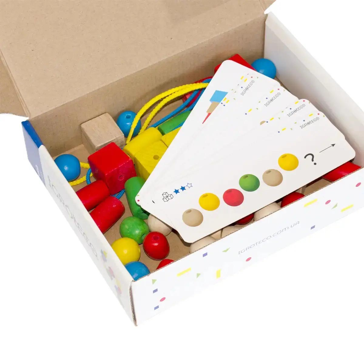 Крім дерев'яних фігурок іграшка укомплектована парою шнурків (40 см кожен) та десятьма двосторонніми картками з цікавими завданнями різного рівня складності (всього 40 завдань). Запропонуйте малюкові вибрати картку зі схемою нанизування фігурок або з цікавим завданням на логіку або запропонуйте відсортувати фігурки за загальною ознакою. Варіантів гри безліч!