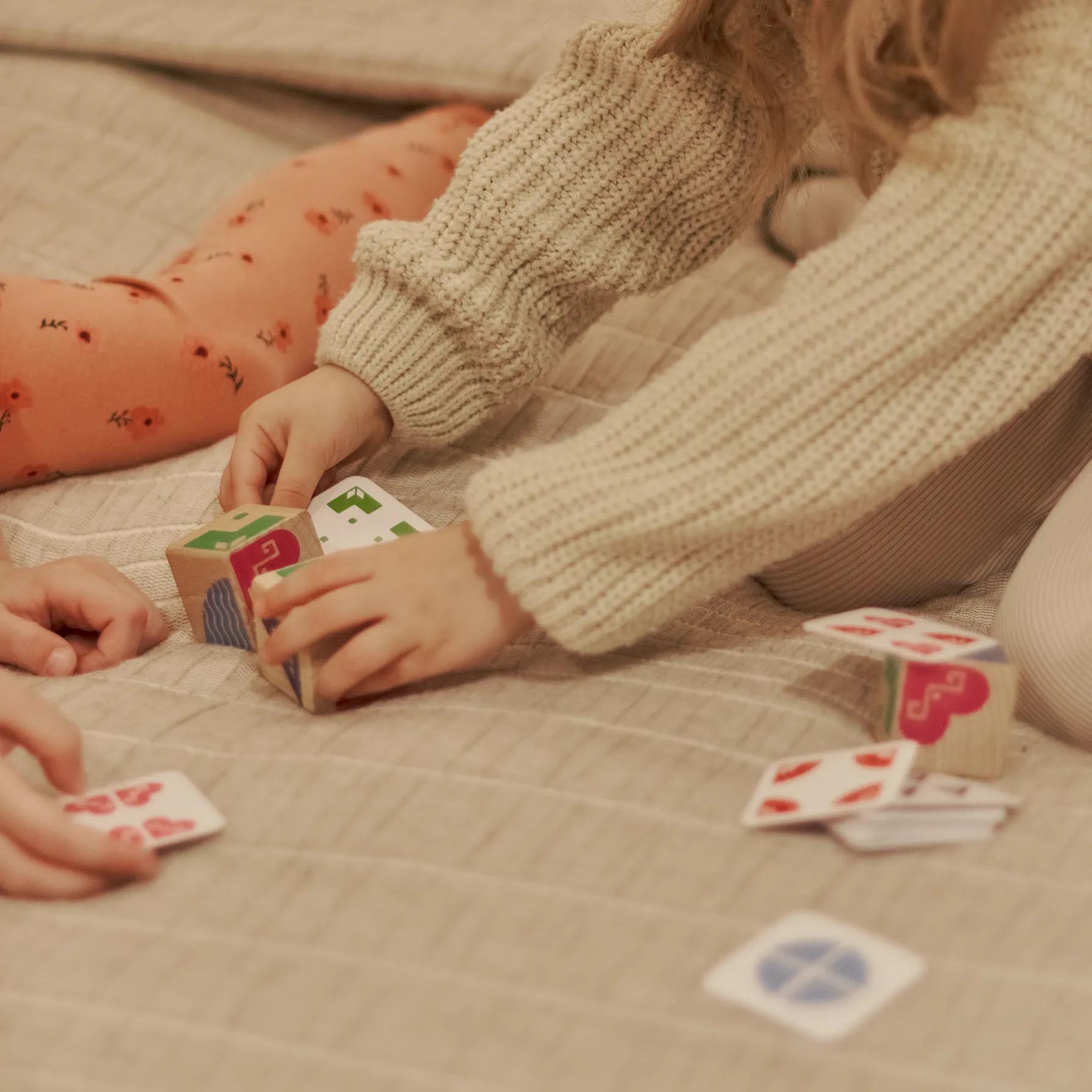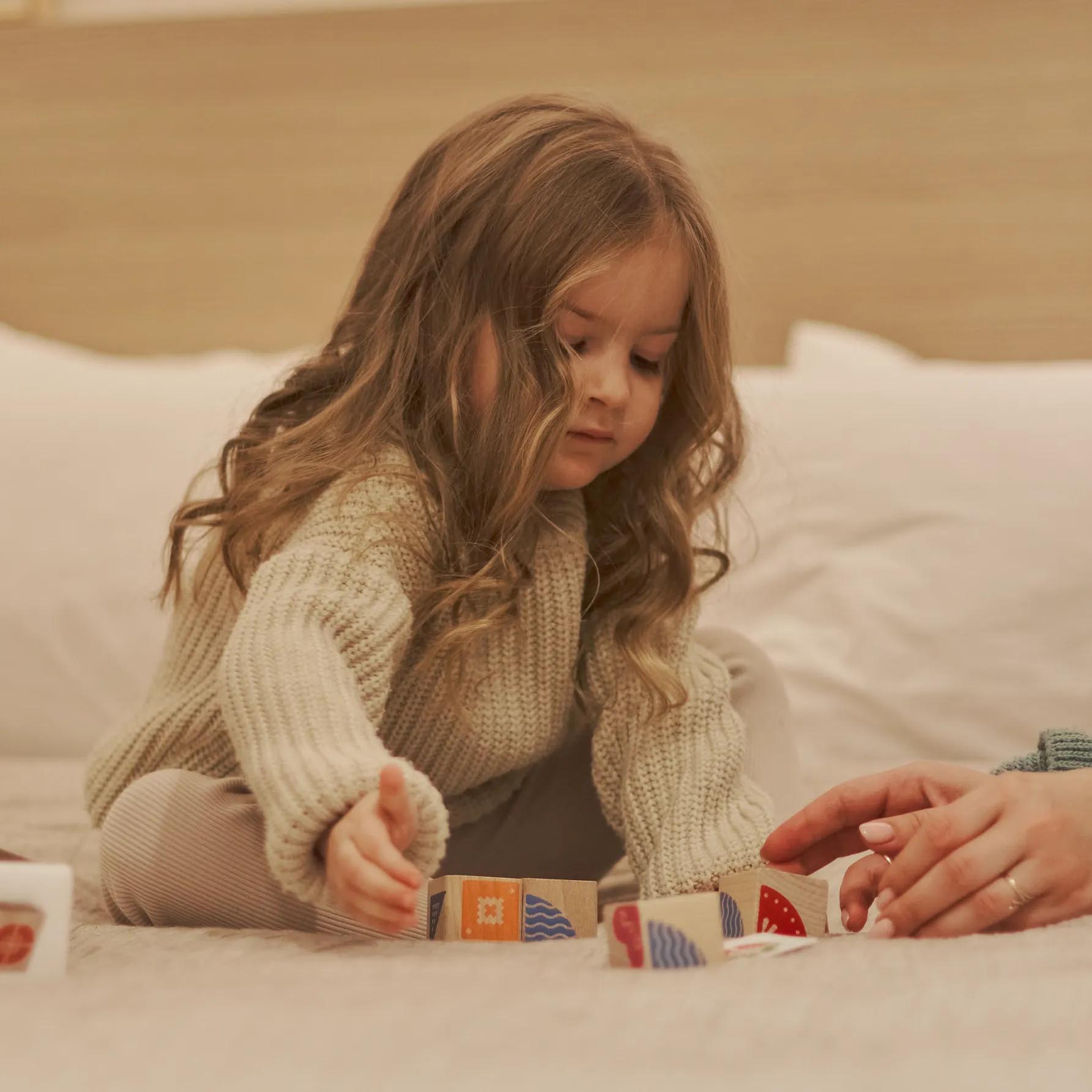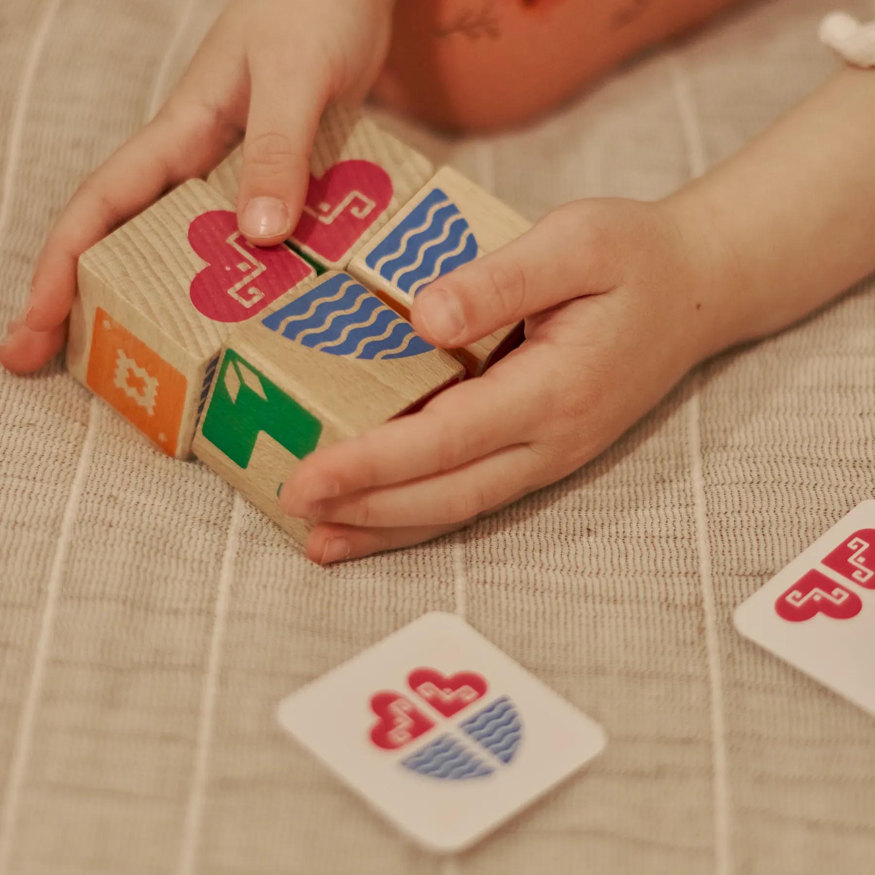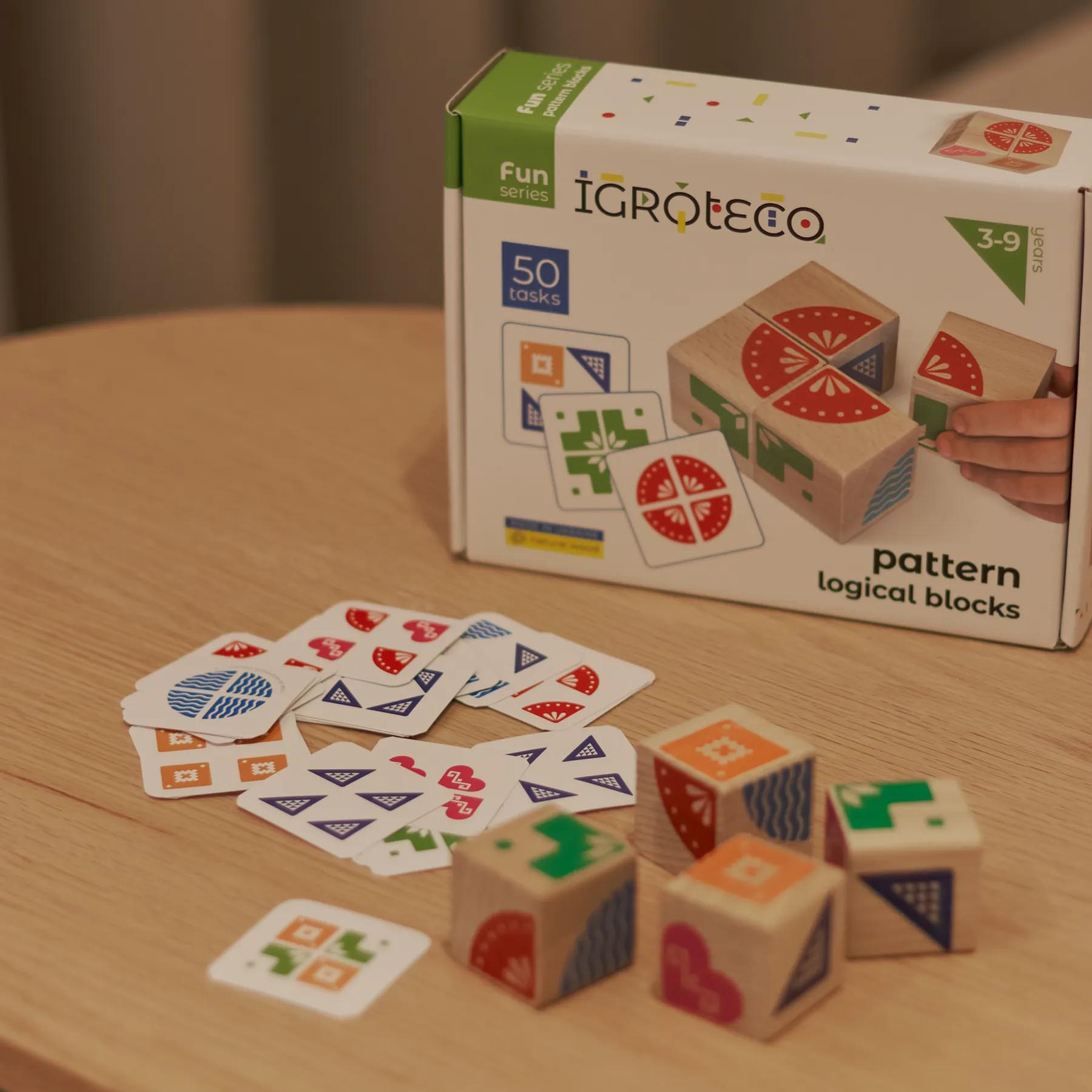 Логічні кубики "Склади візерунок" - логічна гра для малят від 3 років, до якої входять 4 дерев'яні кубики та 50 схем для складання. Як грати? Обирай завдання та повертай кубики так, щоб малюнок верхніх граней збігався з малюнком.