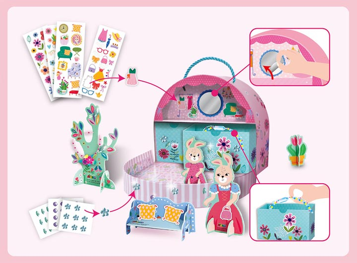 Для створення аплікації з'єднайте частини фігурок тварин та декору, а потім прикрасьте їх за власним бажанням багаторазовими наклейками та стразами. Різноманітні наклейки дозволяють легко зробити справжній витвір мистецтва! В результаті складання малюк отримає фігурки кроликів, яким можна вибрати імена та придумати захоплюючі історії з пригодами на тему "будиночок міс Банні".